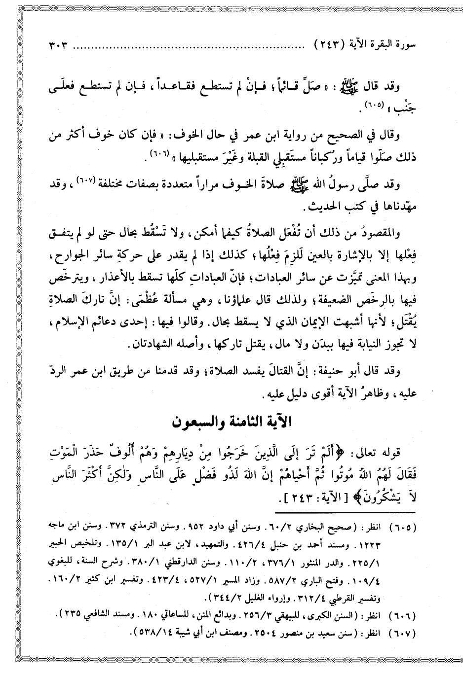 «وَقَدْ صَلَّى رَسُولُ اللَّهِ - صَلَّى اللَّهُ عَلَيْهِ وَسَلَّمَ - صَلَاةَ الْخَوْفَ مِرَارًا مُتَعَدِّدَةً بِصِفَاتٍ مُخْتَلِفَةٍ»، وَقَدْ مَهَّدْنَاهَا فِي كُتُبِ الْحَدِيثِ.