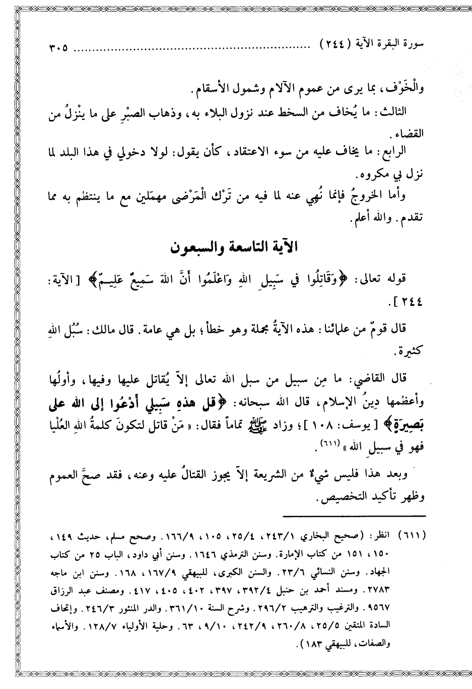 قَالَ الْقَاضِي: مَا مِنْ سَبِيلٍ مِنْ سُبُلِ اللَّهِ تَعَالَى إلَّا يُقَاتَلُ عَلَيْهَا وَفِيهَا، وَأَوَّلُهَا وَأَعْظَمُهَا دِينُ الْإِسْلَامِ قَالَ اللَّهُ سُبْحَانَهُ: {قُلْ هَذِهِ سَبِيلِي أَدْعُو إِلَى اللَّهِ عَلَى بَصِيرَةٍ} [يوسف: 108] وَزَادَ - صَلَّى اللَّهُ عَلَيْهِ وَسَلَّمَ - تَمَامًا فَقَالَ: «مَنْ قَاتَلَ لِتَكُونَ كَلِمَةُ اللَّهِ الْعُلْيَا فَهُوَ فِي سَبِيلِ اللَّهِ».