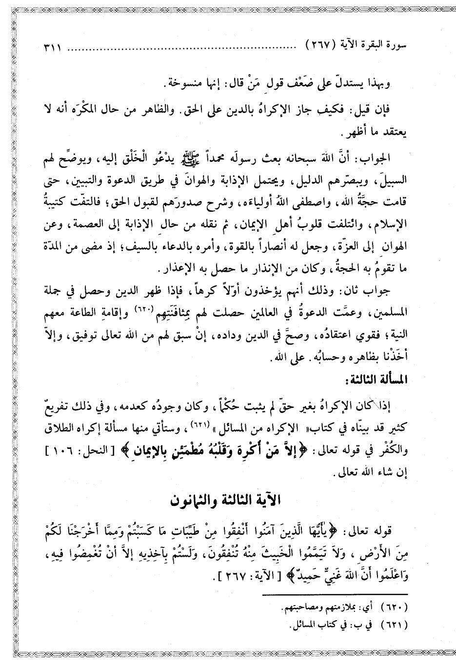 الْآيَةُ الثَّالِثَةُ وَالثَّمَانُونَ قَوْله تَعَالَى: {يَا أَيُّهَا الَّذِينَ آمَنُوا أَنْفِقُوا مِنْ طَيِّبَاتِ مَا كَسَبْتُمْ وَمِمَّا أَخْرَجْنَا لَكُمْ مِنَ الأَرْضِ وَلا تَيَمَّمُوا الْخَبِيثَ مِنْهُ تُنْفِقُونَ وَلَسْتُمْ بِآخِذِيهِ إِلا أَنْ تُغْمِضُوا فِيهِ وَاعْلَمُوا أَنَّ اللَّهَ غَنِيٌّ حَمِيدٌ} [البقرة: 267]