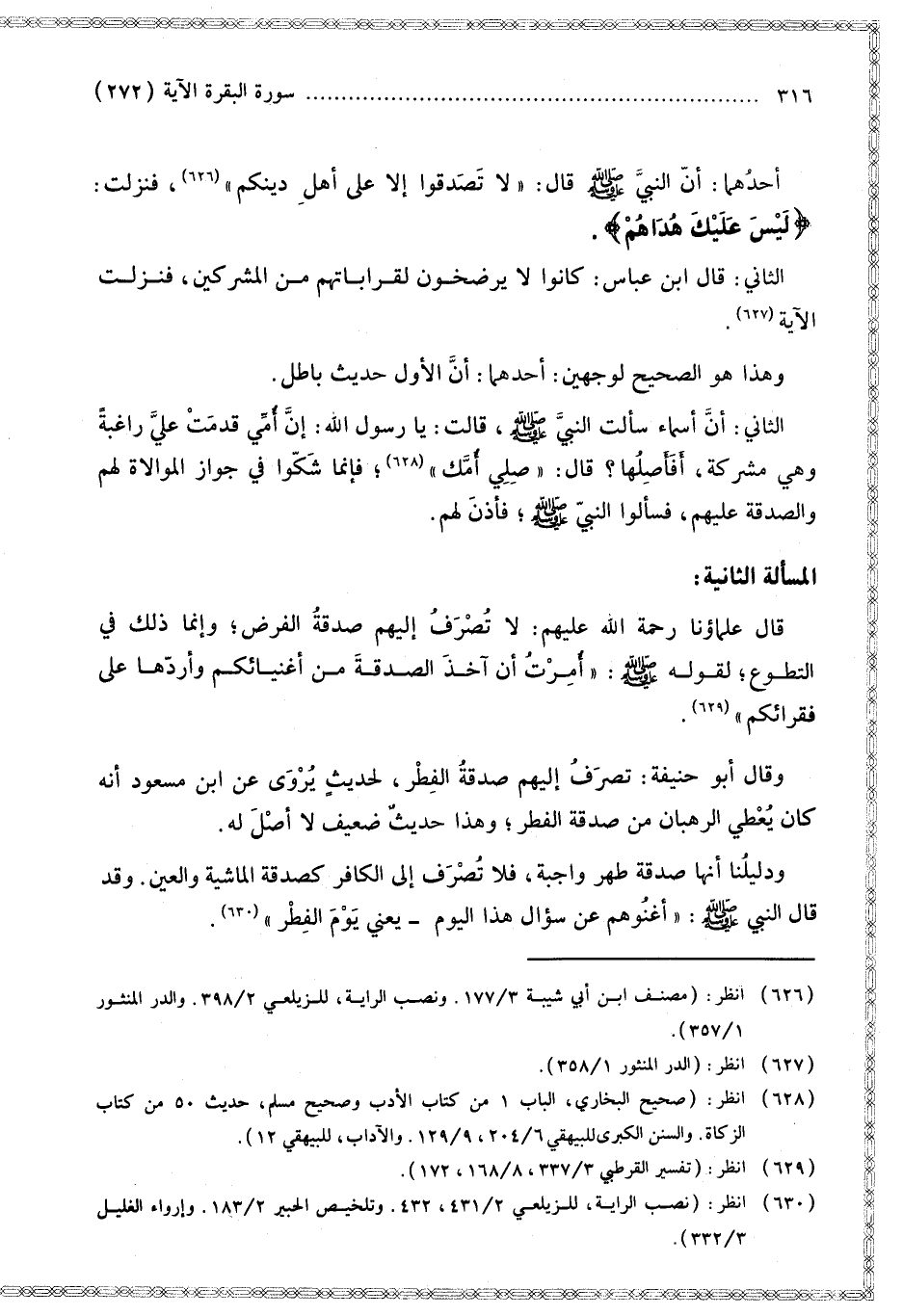 أَحَدُهُمَا: أَنَّ النَّبِيَّ - صَلَّى اللَّهُ عَلَيْهِ وَسَلَّمَ - قَالَ: «لَا تَصَدَّقُوا إلَّا عَلَى أَهْلِ دِينِكُمْ»، فَنَزَلَتْ: {لَيْسَ عَلَيْكَ هُدَاهُمْ} [البقرة: 272]