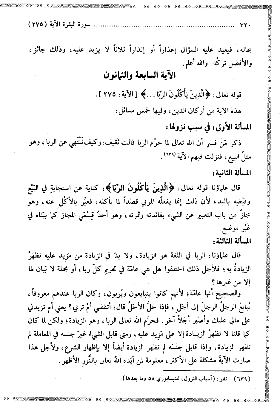 هَذِهِ الْآيَةُ مِنْ أَرْكَانِ الدِّينِ، وَفِيهَا خَمْسُ مَسَائِلَ: الْمَسْأَلَةُ الْأُولَى: فِي سَبَبِ نُزُولِهَا: ذَكَرَ مَنْ فَسَّرَ أَنَّ اللَّهَ تَعَالَى لَمَّا حَرَّمَ الرِّبَا قَالَتْ ثَقِيفٌ: وَكَيْف نَنْتَهِي عَنْ الرِّبَا، وَهُوَ مِثْلُ الْبَيْعِ، فَنَزَلَتْ فِيهِمْ الْآيَةُ.