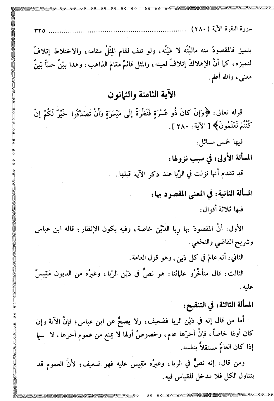 الْمَسْأَلَةُ الثَّانِيَةُ: فِي الْمَعْنَى الْمَقْصُودِ بِهَا: فِيهَا ثَلَاثَةُ أَقْوَالٍ: الْأَوَّلُ: أَنَّ الْمَقْصُودَ بِهَا رِبَا الدَّيْنِ خَاصَّةً، وَفِيهِ يَكُونُ الْإِنْظَارُ؛ قَالَهُ ابْنُ عَبَّاسٍ وَشُرَيْحٌ الْقَاضِي وَالنَّخَعِيُّ.