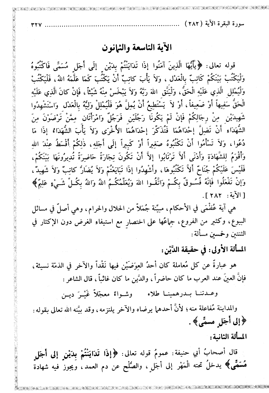 الْآيَةُ التَّاسِعَةُ وَالثَّمَانُونَ قَوْله تَعَالَى: {يَا أَيُّهَا الَّذِينَ آمَنُوا إِذَا تَدَايَنْتُمْ بِدَيْنٍ إِلَى أَجَلٍ مُسَمًّى فَاكْتُبُوهُ وَلْيَكْتُبْ بَيْنَكُمْ كَاتِبٌ بِالْعَدْلِ وَلا يَأْبَ كَاتِبٌ أَنْ يَكْتُبَ كَمَا عَلَّمَهُ اللَّهُ فَلْيَكْتُبْ وَلْيُمْلِلِ الَّذِي عَلَيْهِ الْحَقُّ وَلْيَتَّقِ اللَّهَ رَبَّهُ وَلا يَبْخَسْ مِنْهُ شَيْئًا فَإِنْ كَانَ الَّذِي عَلَيْهِ الْحَقُّ سَفِيهًا أَوْ ضَعِيفًا أَوْ لا يَسْتَطِيعُ أَنْ يُمِلَّ هُوَ فَلْيُمْلِلْ وَلِيُّهُ بِالْعَدْلِ وَاسْتَشْهِدُوا شَهِيدَيْنِ مِنْ رِجَالِكُمْ فَإِنْ لَمْ يَكُونَا رَجُلَيْنِ فَرَجُلٌ وَامْرَأَتَانِ مِمَّنْ تَرْضَوْنَ مِنَ الشُّهَدَاءِ أَنْ تَضِلَّ إِحْدَاهُمَا فَتُذَكِّرَ إِحْدَاهُمَا الأُخْرَى وَلا يَأْبَ الشُّهَدَاءُ إِذَا مَا دُعُوا وَلا تَسْأَمُوا أَنْ تَكْتُبُوهُ صَغِيرًا أَوْ كَبِيرًا إِلَى أَجَلِهِ ذَلِكُمْ أَقْسَطُ عِنْدَ اللَّهِ وَأَقْوَمُ لِلشَّهَادَةِ وَأَدْنَى أَلا تَرْتَابُوا إِلا أَنْ تَكُونَ تِجَارَةً حَاضِرَةً تُدِيرُونَهَا بَيْنَكُمْ فَلَيْسَ عَلَيْكُمْ جُنَاحٌ أَلا تَكْتُبُوهَا وَأَشْهِدُوا إِذَا تَبَايَعْتُمْ وَلا يُضَارَّ كَاتِبٌ وَلا شَهِيدٌ وَإِنْ تَفْعَلُوا فَإِنَّهُ فُسُوقٌ بِكُمْ وَاتَّقُوا اللَّهَ وَيُعَلِّمُكُمُ اللَّهُ وَاللَّهُ بِكُلِّ شَيْءٍ عَلِيمٌ} [البقرة: 282]