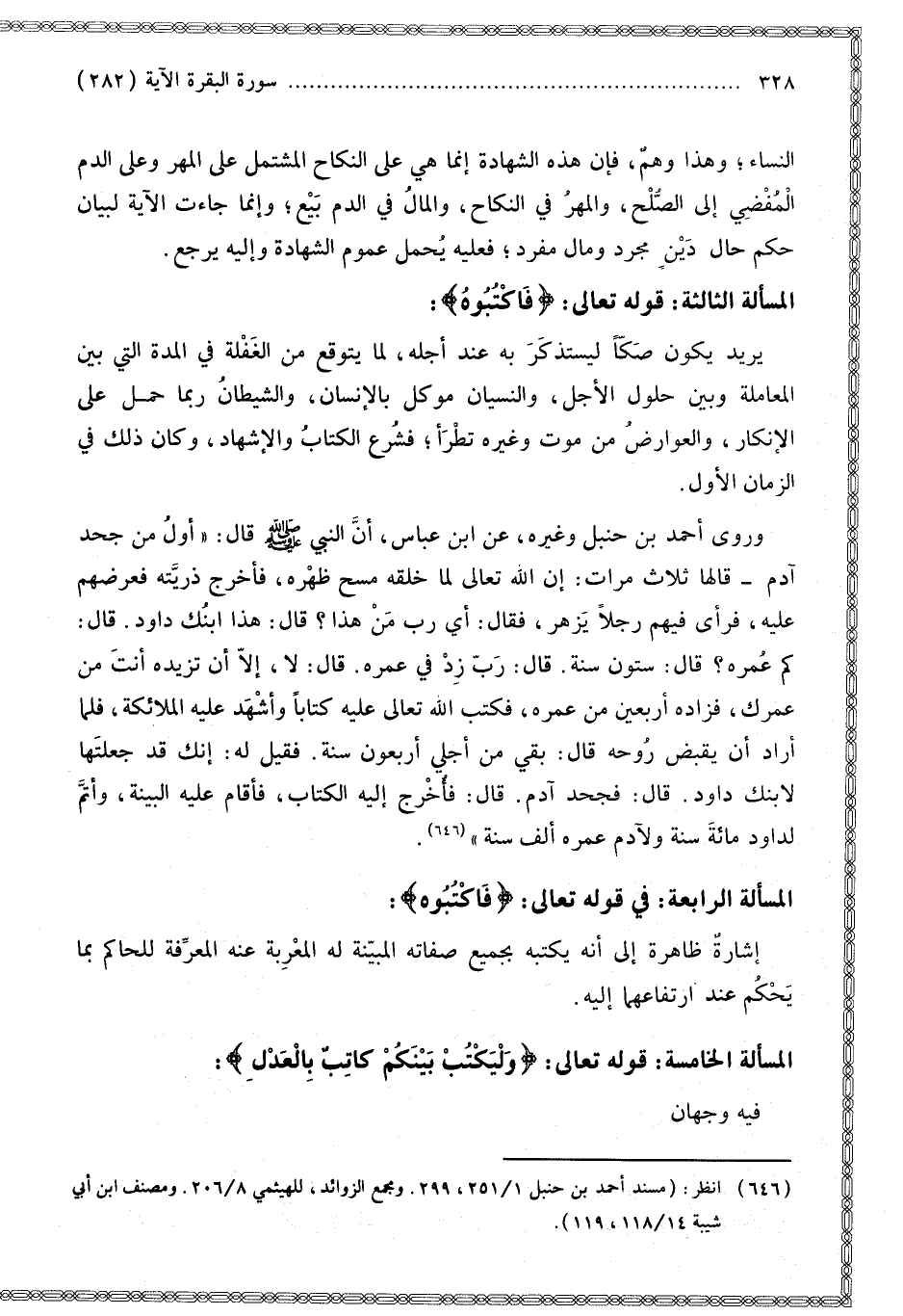 الْمَسْأَلَةُ الرَّابِعَةُ: فِي قَوْله تَعَالَى: {فَاكْتُبُوهُ} [البقرة: 282] إشَارَةٌ ظَاهِرَةٌ إلَى أَنَّهُ يَكْتُبُهُ بِجَمِيعِ صِفَاتِهِ الْمُبَيَّنَةِ لَهُ الْمُعْرِبَةِ عَنْهُ الْمُعَرِّفَةِ لِلْحَاكِمِ بِمَا يَحْكُمُ عِنْدَ ارْتِفَاعِهِمَا إلَيْهِ.