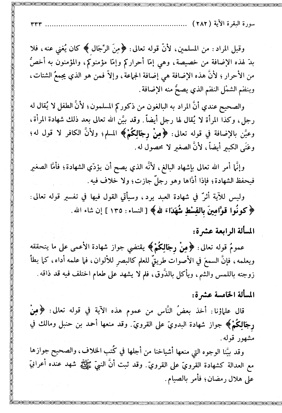 وَقَدْ بَيَّنَ اللَّهُ تَعَالَى بَعْدَ ذَلِكَ شَهَادَةَ الْمَرْأَةِ، وَعَيَّنَ بِالْإِضَافَةِ فِي قَوْله تَعَالَى: {مِنْ رِجَالِكُمْ} [البقرة: 282] الْمُسْلِمَ وَلِأَنَّ الْكَافِرَ لَا قَوْلَ لَهُ؛ وَعَنَى الْكَبِيرَ أَيْضًا؛ لِأَنَّ الصَّغِيرَ لَا مَحْصُولَ لَهُ.