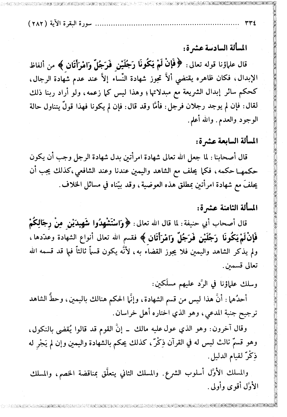 الْمَسْأَلَةُ السَّابِعَةَ عَشْرَةَ: قَالَ أَصْحَابُنَا: لَمَّا جَعَلَ اللَّهُ تَعَالَى شَهَادَةَ امْرَأَتَيْنِ بَدَلَ شَهَادَةِ الرَّجُلِ وَجَبَ أَنْ يَكُونَ حُكْمُهَا حُكْمَهُ، فَكَمَا يَحْلِفُ مَعَ الشَّاهِدِ وَالْيَمِينِ عِنْدَنَا وَعِنْدَ الشَّافِعِيِّ، كَذَلِكَ يَجِبُ أَنْ يَحْلِفَ مَعَ شَهَادَةِ امْرَأَتَيْنِ بِمُطْلَقِ هَذِهِ الْعِوَضِيَّةِ، وَقَدْ بَيَّنَّاهُ فِي مَسَائِلِ الْخِلَافِ.