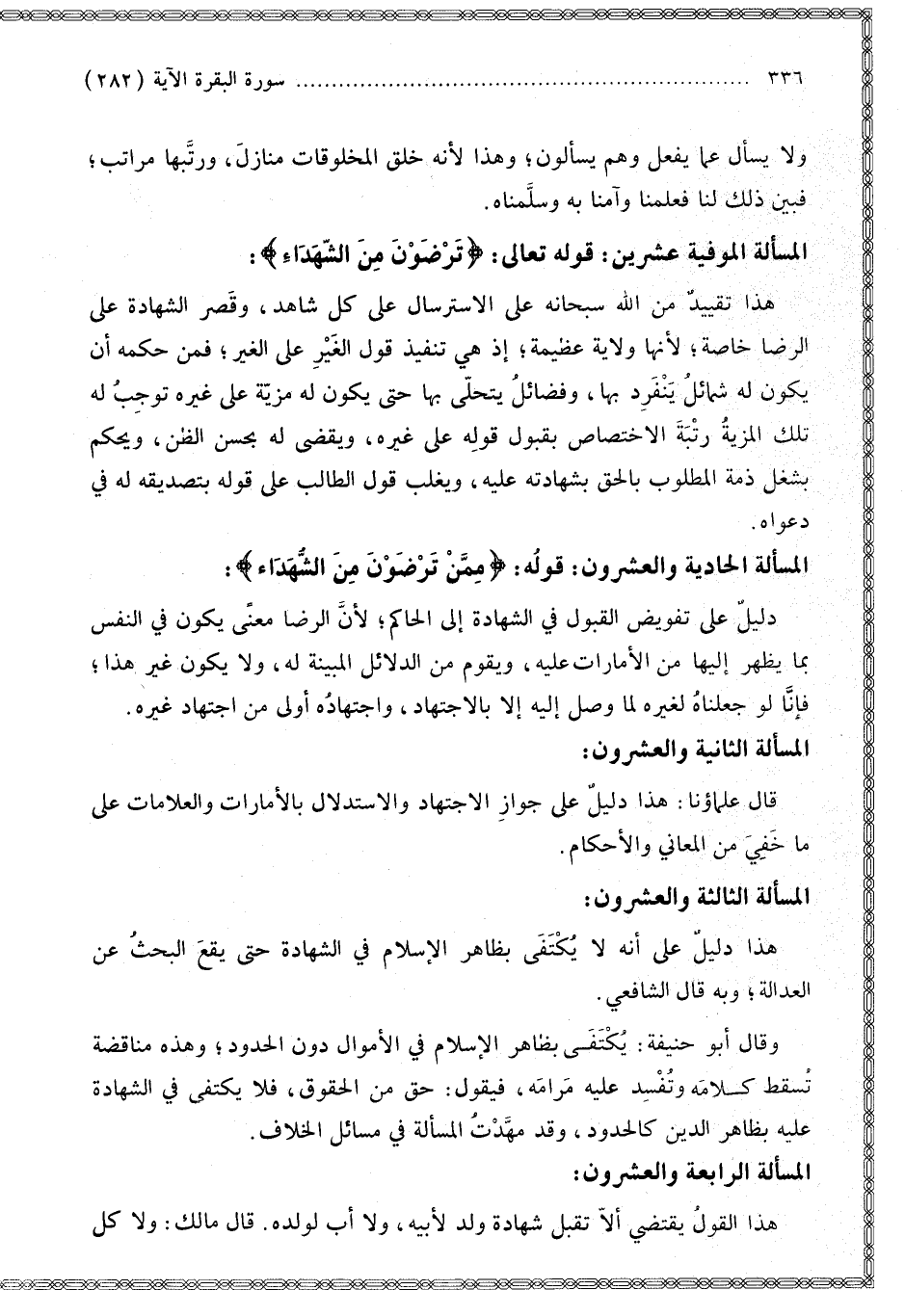الْمَسْأَلَةُ الْمُوفِيَةُ عِشْرِينَ: قَوْله تَعَالَى: {تَرْضَوْنَ مِنَ الشُّهَدَاءِ} [البقرة: 282] هَذَا تَقْيِيدٌ مِنْ اللَّهِ سُبْحَانَهُ عَلَى الِاسْتِرْسَالِ عَلَى كُلِّ شَاهِدٍ، وَقَصَرَ الشَّهَادَةَ عَلَى الرِّضَا خَاصَّةً؛ لِأَنَّهَا وِلَايَةٌ عَظِيمَةٌ؛ إذْ هِيَ تَنْفِيذُ قَوْلِ الْغَيْرِ عَلَى الْغَيْرِ؛ فَمِنْ حُكْمِهِ أَنْ يَكُونَ لَهُ شَمَائِلُ يَنْفَرِدُ بِهَا، وَفَضَائِلُ يَتَحَلَّى بِهَا حَتَّى يَكُونَ لَهُ مَزِيَّةٌ عَلَى غَيْرِهِ تُوجِبُ لَهُ تِلْكَ الْمَزِيَّةُ رُتْبَةَ الِاخْتِصَاصِ بِقَبُولِ قَوْلِهِ عَلَى غَيْرِهِ، وَيُقْضَى لَهُ بِحُسْنِ الظَّنِّ، وَيُحْكَمُ بِشُغْلِ ذِمَّةِ الْمَطْلُوبِ بِالْحَقِّ بِشَهَادَتِهِ عَلَيْهِ، وَيُغَلَّبُ قَوْلُ الطَّالِبِ عَلَى قَوْلِهِ بِتَصْدِيقِهِ لَهُ فِي دَعْوَاهُ.