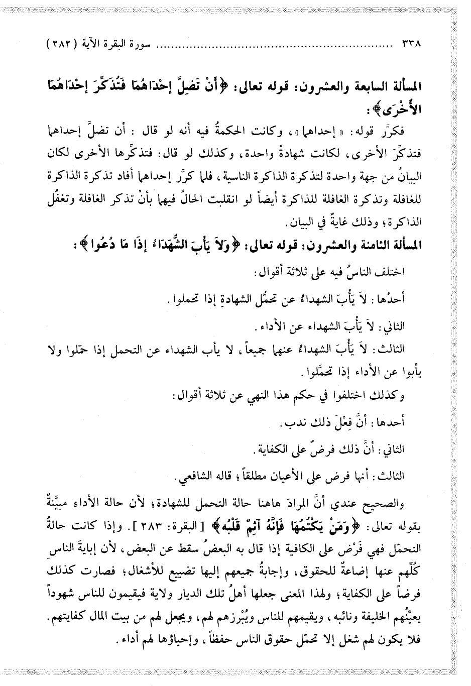 الْمَسْأَلَةُ السَّابِعَةُ وَالْعِشْرُونَ: قَوْله تَعَالَى: {أَنْ تَضِلَّ إِحْدَاهُمَا فَتُذَكِّرَ إِحْدَاهُمَا الأُخْرَى} [البقرة: 282] فَكَرَّرَ قَوْلَهُ: " إحْدَاهُمَا " وَكَانَتْ الْحِكْمَةُ فِيهِ أَنَّهُ لَوْ قَالَ: أَنْ تَضِلَّ إحْدَاهُمَا فَتُذَكِّرَ الْأُخْرَى، لَكَانَتْ شَهَادَةً وَاحِدَةً، وَكَذَلِكَ لَوْ قَالَ: فَتُذَكِّرَهَا الْأُخْرَى لَكَانَ الْبَيَانُ مِنْ جِهَةٍ وَاحِدَةٍ لِتَذْكِرَةِ الذَّاكِرَةِ النَّاسِيَةِ، فَلَمَّا كَرَّرَ إحْدَاهُمَا أَفَادَ تَذْكِرَةَ الذَّاكِرَةِ لِلْغَافِلَةِ وَتَذْكِرَةَ الْغَافِلَةِ لِلذَّاكِرَةِ أَيْضًا لَوْ انْقَلَبَتْ الْحَالُ فِيهِمَا بِأَنْ تَذْكُرَ الْغَافِلَةُ وَتَغْفُلَ الذَّاكِرَةُ؛ وَذَلِكَ غَايَةٌ فِي الْبَيَانِ.