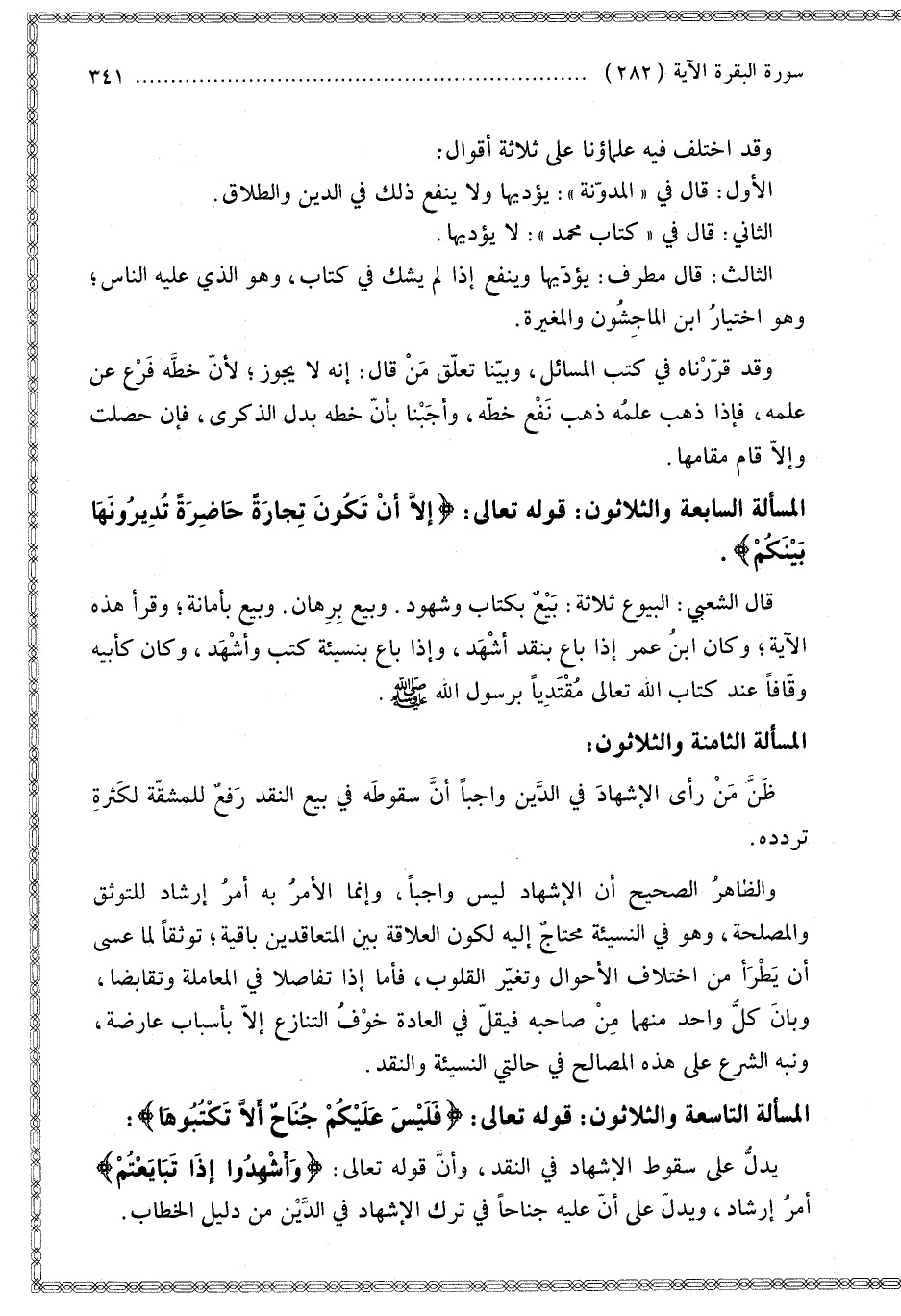 الْمَسْأَلَةُ التَّاسِعَةُ وَالثَّلَاثُونَ: قَوْله تَعَالَى: {فَلَيْسَ عَلَيْكُمْ جُنَاحٌ أَلا تَكْتُبُوهَا} [البقرة: 282] يَدُلُّ عَلَى سُقُوطِ الْإِشْهَادِ فِي النَّقْدِ، وَأَنَّ قَوْله تَعَالَى: {وَأَشْهِدُوا إِذَا تَبَايَعْتُمْ} [البقرة: 282] أَمْرُ إرْشَادٍ، وَيَدُلُّ عَلَى أَنَّ عَلَيْهِ جُنَاحًا فِي تَرْكِ الْإِشْهَادِ فِي الدَّيْنِ مِنْ دَلِيلِ الْخِطَابِ
