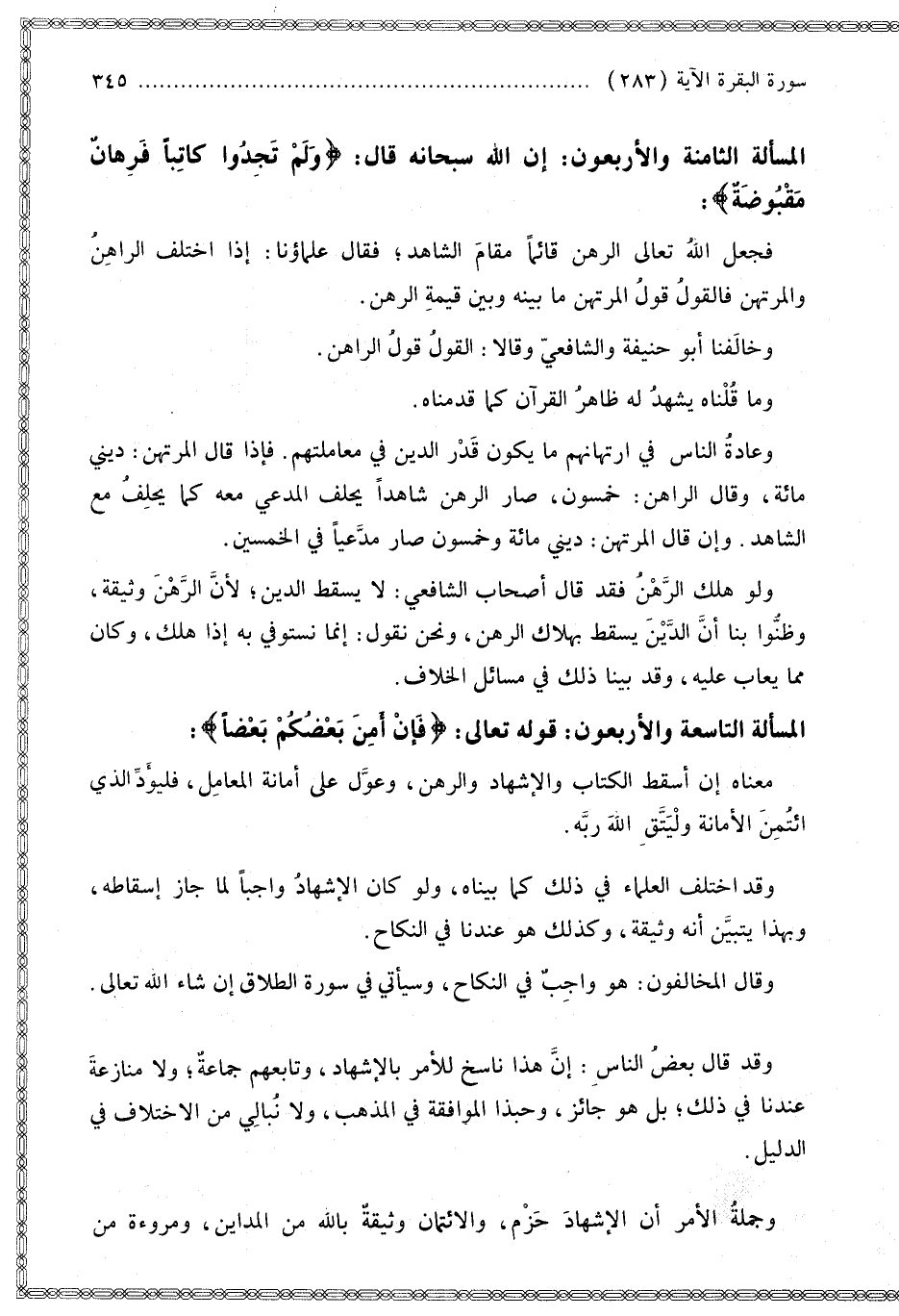 الْمَسْأَلَةُ التَّاسِعَةُ وَالْأَرْبَعُونَ: قَوْله تَعَالَى: {فَإِنْ أَمِنَ بَعْضُكُمْ بَعْضًا} [البقرة: 283] مَعْنَاهُ إنْ أَسْقَطَ الْكِتَابَ وَالْإِشْهَادَ وَالرَّهْنَ، وَعَوَّلَ عَلَى أَمَانَةِ الْمُعَامِلِ، فَلْيُؤَدِّ الَّذِي ائْتُمِنَ الْأَمَانَةَ وَلْيَتَّقِ اللَّهَ رَبَّهُ.