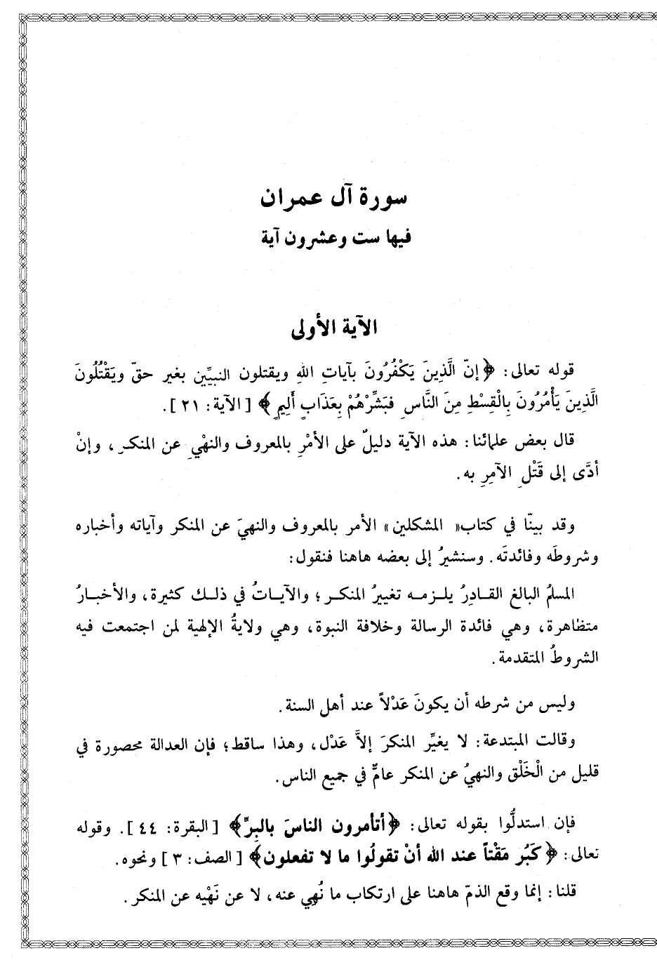 الْآيَة الْأُولَى قَوْله تَعَالَى: {إِنَّ الَّذِينَ يَكْفُرُونَ بِآيَاتِ اللَّهِ وَيَقْتُلُونَ النَّبِيِّينَ بِغَيْرِ حَقٍّ وَيَقْتُلُونَ الَّذِينَ يَأْمُرُونَ بِالْقِسْطِ مِنَ النَّاسِ فَبَشِّرْهُمْ بِعَذَابٍ أَلِيمٍ} [آل عمران: 21] قَالَ بَعْضُ عُلَمَائِنَا: هَذِهِ الْآيَةُ دَلِيلٌ عَلَى الْأَمْرِ بِالْمَعْرُوفِ وَالنَّهْيِ عَنْ الْمُنْكَرِ، وَإِنْ أَدَّى إلَى قَتْلِ الْآمِرِ بِهِ. وَقَدْ بَيَّنَّا فِي كِتَابِ " الْمُشْكِلَيْنِ " الْأَمْرُ بِالْمَعْرُوفِ وَالنَّهْيُ عَنْ الْمُنْكَرِ وَآيَاتُهُ وَأَخْبَارُهُ وَشُرُوطُهُ وَفَائِدَتِهِ. وَسَنُشِيرُ إلَى بَعْضِهِ هَاهُنَا فَنَقُولُ: الْمُسْلِمُ الْبَالِغُ الْقَادِرُ يَلْزَمُهُ تَغْيِيرُ الْمُنْكَرِ؛ وَالْآيَاتُ فِي ذَلِكَ كَثِيرَةٌ، وَالْأَخْبَارُ مُتَظَاهِرَةٌ، وَهِيَ فَائِدَةُ الرِّسَالَةِ وَخِلَافَةِ النُّبُوَّةِ، وَهِيَ وِلَايَةُ الْإِلَهِيَّةِ لِمَنْ اجْتَمَعَتْ فِيهِ الشُّرُوطُ الْمُتَقَدِّمَةُ.