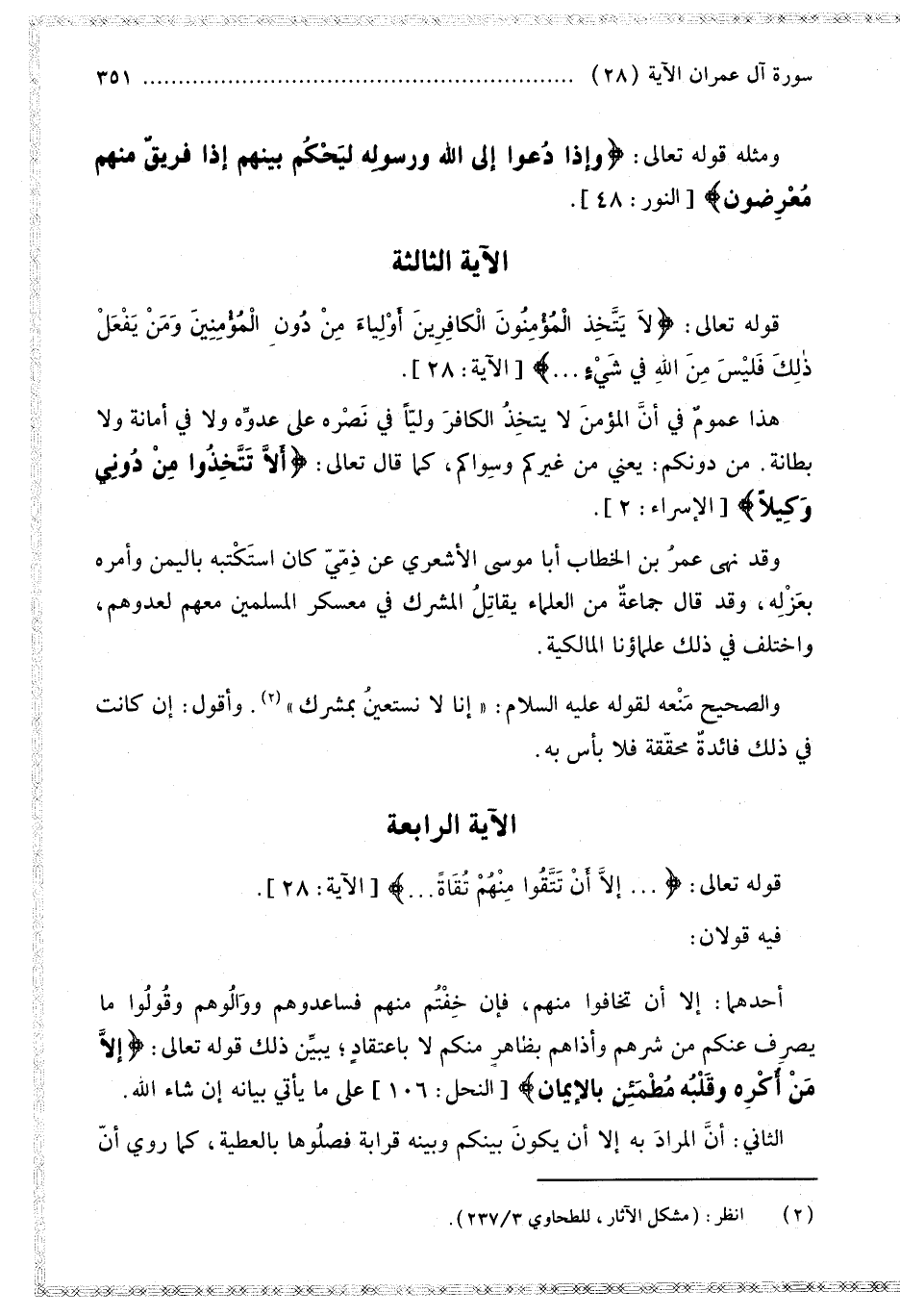 َ وَمَنْ يَفْعَلْ ذَلِكَ فَلَيْسَ مِنَ اللَّهِ فِي شَيْءٍ} [آل عمران: 28] هَذَا عُمُومٌ فِي أَنَّ الْمُؤْمِنَ لَا يَتَّخِذُ الْكَافِرَ وَلِيًّا فِي نَصْرِهِ عَلَى عَدُوِّهِ وَلَا فِي أَمَانَةٍ وَلَا بِطَانَةٍ. مِنْ دُونِكُمْ: يَعْنِي مِنْ غَيْرِكُمْ وَسِوَاكُمْ، كَمَا قَالَ تَعَالَى: {أَلا تَتَّخِذُوا مِنْ دُونِي وَكِيلا} [الإسراء: 2] وَقَدْ نَهَى عُمَرُ بْنُ الْخَطَّابِ أَبَا مُوسَى الْأَشْعَرِيَّ عَنْ ذِمِّيٍّ كَانَ اسْتَكْتَبَهُ بِالْيَمَنِ وَأَمَرَهُ بِعَزْلِهِ، وَقَدْ قَالَ جَمَاعَةٌ مِنْ الْعُلَمَاءِ: يُقَاتِلُ الْمُشْرِكُ فِي مُعَسْكَرِ الْمُسْلِمِينَ مَعَهُمْ لِعَدُوِّهِمْ، وَاخْتَلَفَ فِي ذَلِكَ عُلَمَاؤُنَا الْمَالِكِيَّةُ. وَالصَّحِيحُ مَنْعُهُ لِقَوْلِهِ - عَلَيْهِ السَّلَامُ -: «إنَّا لَا نَسْتَعِينُ بِمُشْرِكٍ». وَأَقُولُ: إنْ كَانَتْ فِي ذَلِكَ فَائِدَةٌ مُحَقَّقَةٌ فَلَا بَأْسَ بِهِ.