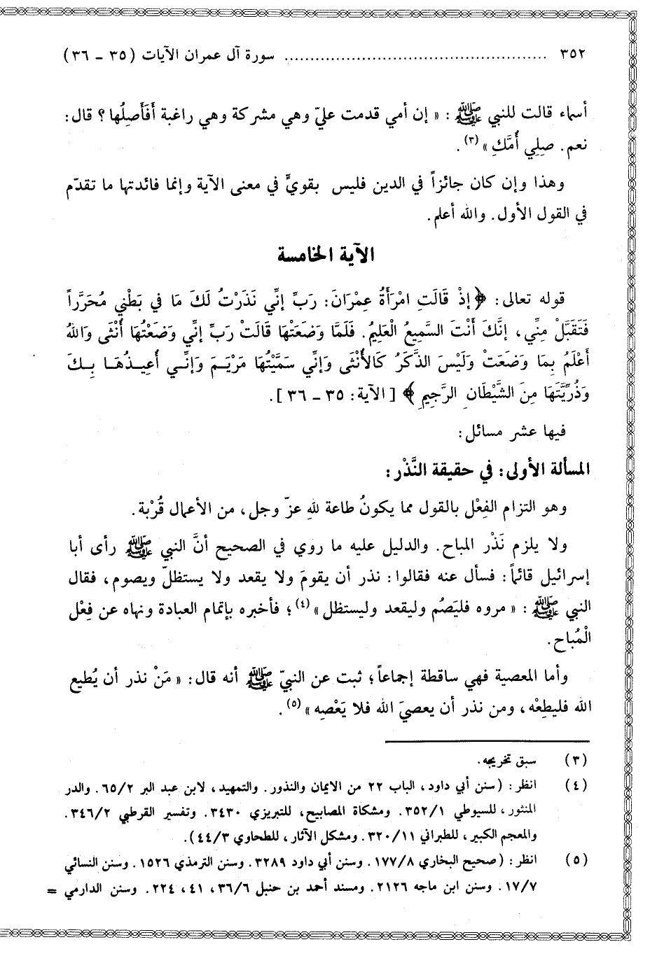 الْآيَةُ الْخَامِسَةُ قَوْله تَعَالَى: {إِذْ قَالَتِ امْرَأَتُ عِمْرَانَ رَبِّ إِنِّي نَذَرْتُ لَكَ مَا فِي بَطْنِي مُحَرَّرًا فَتَقَبَّلْ مِنِّي إِنَّكَ أَنْتَ السَّمِيعُ الْعَلِيمُ} [آل عمران: 35] {فَلَمَّا وَضَعَتْهَا قَالَتْ رَبِّ إِنِّي وَضَعْتُهَا أُنْثَى وَاللَّهُ أَعْلَمُ بِمَا وَضَعَتْ وَلَيْسَ الذَّكَرُ كَالأُنْثَى وَإِنِّي سَمَّيْتُهَا مَرْيَمَ وَإِنِّي أُعِيذُهَا بِكَ وَذُرِّيَّتَهَا مِنَ الشَّيْطَانِ الرَّجِيمِ} [آل عمران: 36] فِيهَا عَشْرُ مَسَائِلَ: