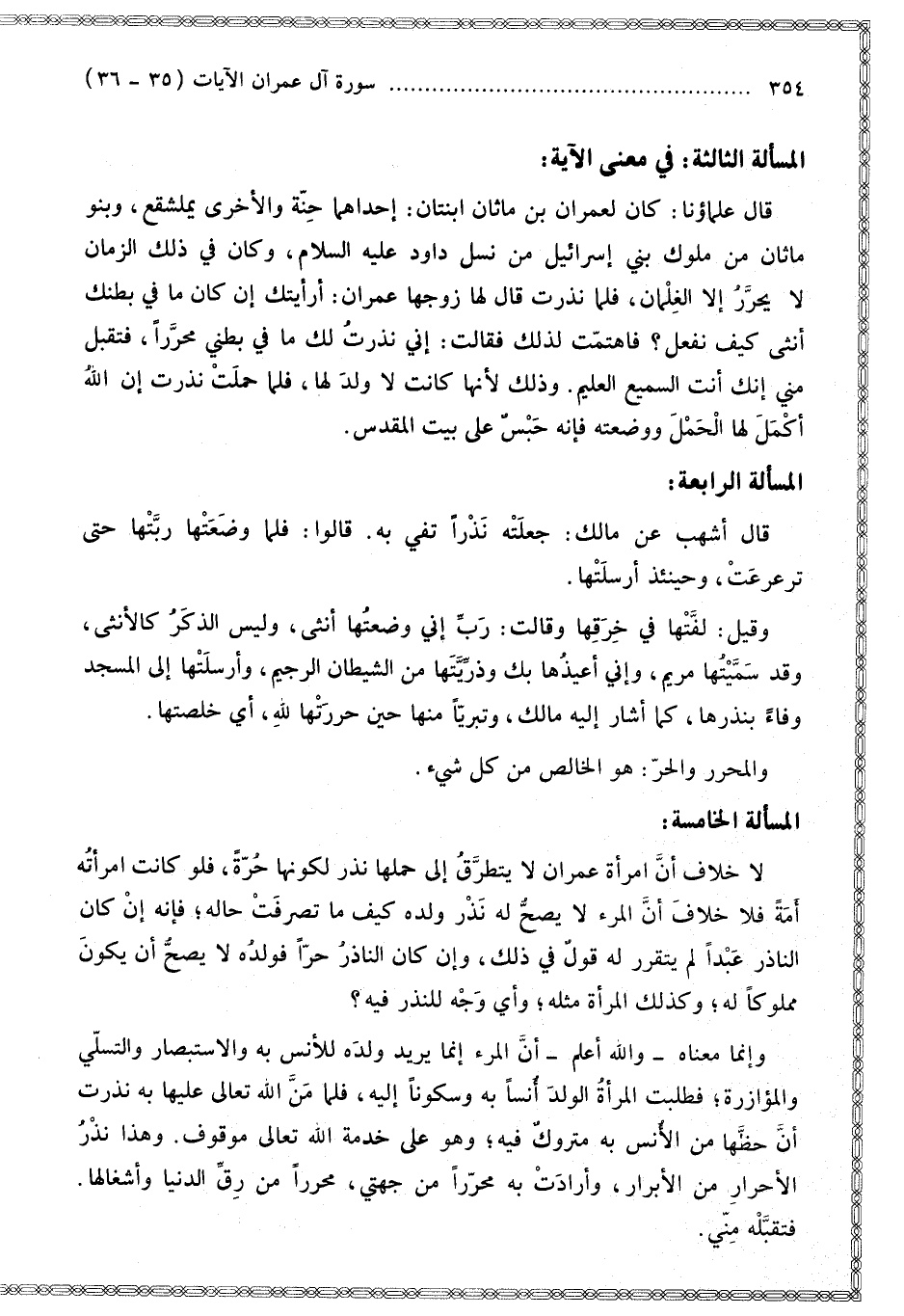 الْمَسْأَلَةُ الثَّالِثَةُ فِي مَعْنَى الْآيَةِ: قَالَ عُلَمَاؤُنَا: كَانَ لِعِمْرَانَ بْنِ مَاثَانَ ابْنَتَانِ: إحْدَاهُمَا حِنَّةُ وَالْأُخْرَى يملشقع وَبَنُو مَاثَانَ مِنْ مُلُوكِ بَنِي إسْرَائِيلَ مِنْ نَسْلِ دَاوُد - عَلَيْهِ السَّلَامُ - وَكَانَ فِي ذَلِكَ الزَّمَانِ لَا يُحَرَّرُ إلَّا الْغِلْمَانُ، فَلَمَّا نَذَرَتْ قَالَ لَهَا زَوْجُهَا عِمْرَانُ: أَرَأَيْتُكِ إنْ كَانَ مَا فِي بَطْنِكِ أُنْثَى كَيْفَ نَفْعَلُ؟ فَاهْتَمَّتْ لِذَلِكَ فَقَالَتْ: إنِّي نَذَرْتُ لَكَ مَا فِي بَطْنِي مُحَرَّرًا، فَتَقَبَّلْ مِنِّي إنَّكَ أَنْتَ السَّمِيعُ الْعَلِيمُ. وَذَلِكَ لِأَنَّهَا كَانَتْ لَا وَلَدَ لَهَا، فَلَمَّا حَمَلَتْ نَذَرَتْ إنْ اللَّهُ أَكْمَلَ لَهَا الْحَمْلَ وَوَضَعَتْهُ فَإِنَّهُ حَبْسٌ عَلَى بَيْتِ الْمَقْدِسِ.