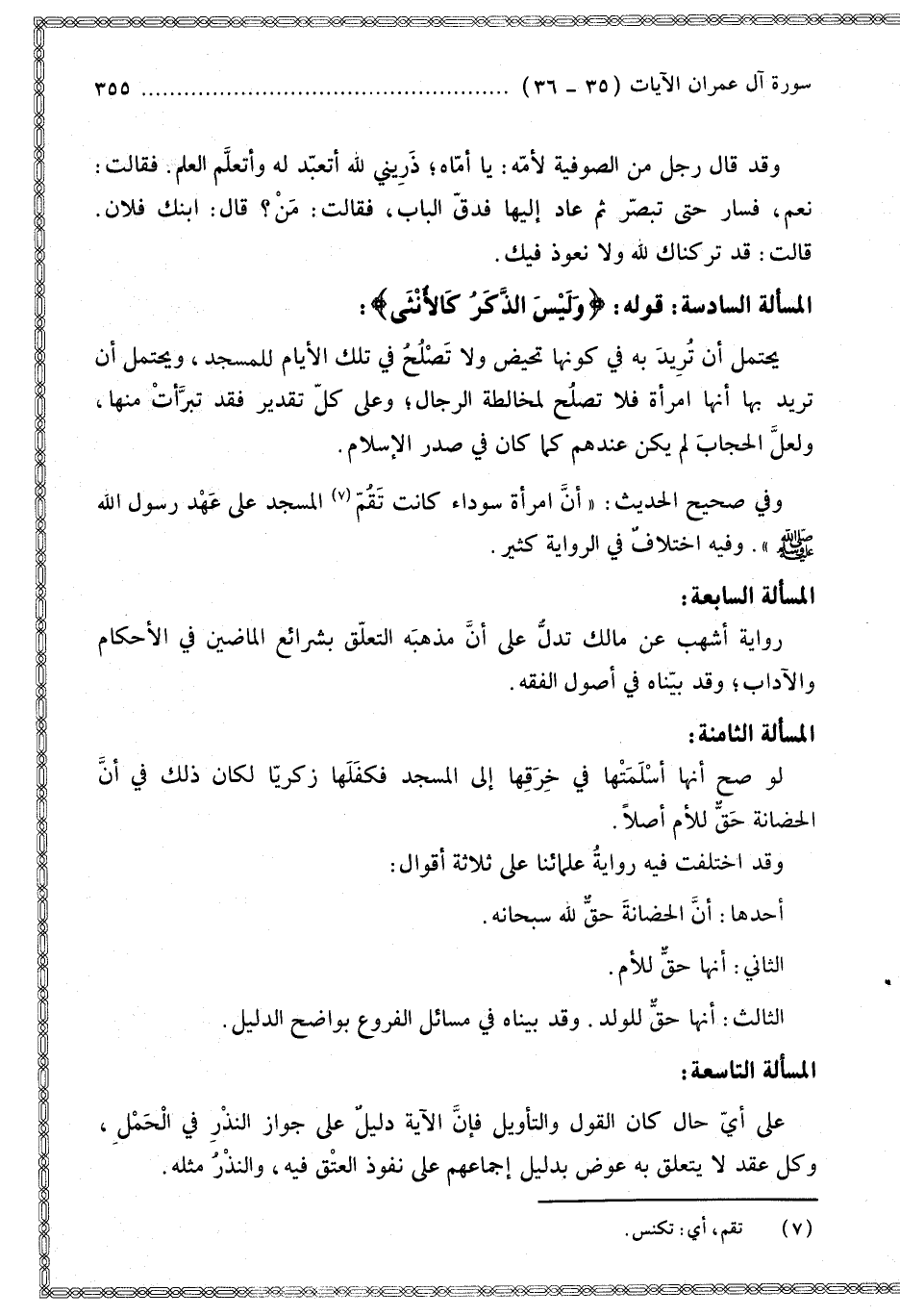 الْمَسْأَلَةُ السَّادِسَةُ قَوْلُهُ: {وَلَيْسَ الذَّكَرُ كَالأُنْثَى} [آل عمران: 36] يُحْتَمَلُ أَنْ تُرِيدَ بِهِ فِي كَوْنِهَا تَحِيضُ وَلَا تَصْلُحُ فِي تِلْكَ الْأَيَّامِ لِلْمَسْجِدِ، وَيُحْتَمَلُ أَنْ تُرِيدَ بِهَا أَنَّهَا امْرَأَةٌ فَلَا تَصْلُحُ لِمُخَالَطَةِ الرِّجَالِ؛ وَعَلَى كُلِّ تَقْدِيرٍ فَقَدْ تَبَرَّأَتْ مِنْهَا، وَلَعَلَّ الْحِجَابَ لَمْ يَكُنْ عِنْدَهُمْ كَمَا كَانَ فِي صَدْرِ الْإِسْلَامِ. وَفِي صَحِيحِ الْحَدِيثِ: «أَنَّ امْرَأَةً سَوْدَاءَ كَانَتْ تَقُمَّ الْمَسْجِدَ عَلَى عَهْدِ رَسُولِ اللَّهِ - صَلَّى اللَّهُ عَلَيْهِ وَسَلَّمَ -». وَفِيهِ اخْتِلَافٌ فِي الرِّوَايَةِ كَثِيرٌ. الْمَسْأَلَةُ السَّابِعَةُ رِوَايَةُ أَشْهَبَ عَنْ مَالِكٍ تَدُلُّ عَلَى أَنَّ مَذْهَبَهُ التَّعَلُّقُ بِشَرَائِعِ الْمَاضِينَ فِي الْأَحْكَامِ وَالْآدَابِ؛ وَقَدْ بَيَّنَّاهُ فِي أُصُولِ الْفِقْهِ.