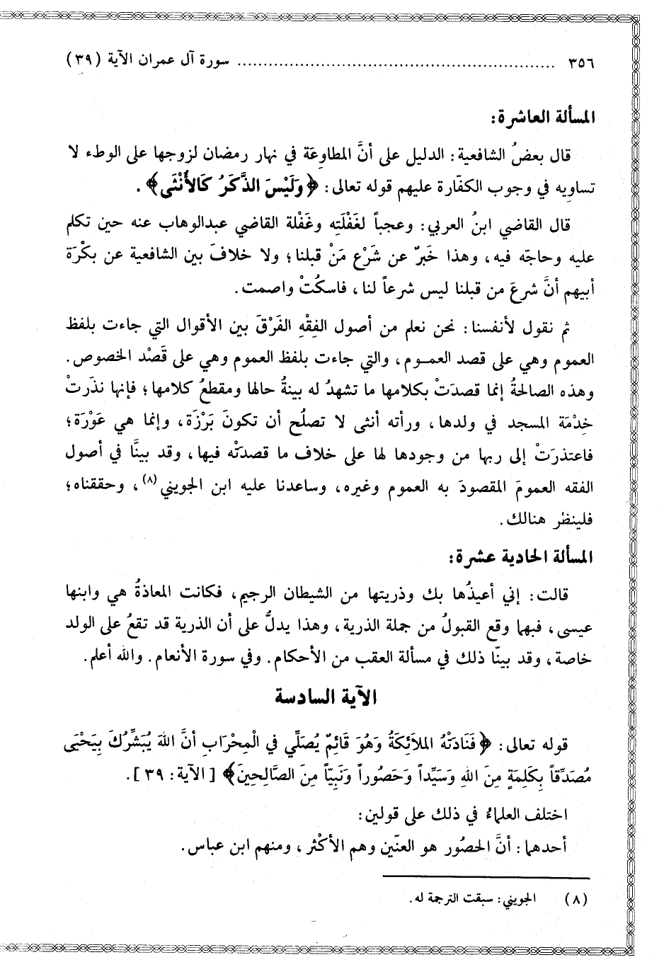 ِ أَنَّ اللَّهَ يُبَشِّرُكَ بِيَحْيَى مُصَدِّقًا بِكَلِمَةٍ مِنَ اللَّهِ وَسَيِّدًا وَحَصُورًا وَنَبِيًّا مِنَ الصَّالِحِينَ} [آل عمران: 39] اخْتَلَفَ الْعُلَمَاءُ فِي ذَلِكَ عَلَى قَوْلَيْنِ: أَحَدُهُمَا: أَنَّ الْحَصُورَ هُوَ الْعِنِّينُ وَهُمْ الْأَكْثَرُ، وَمِنْهُمْ ابْنُ عَبَّاسٍ.