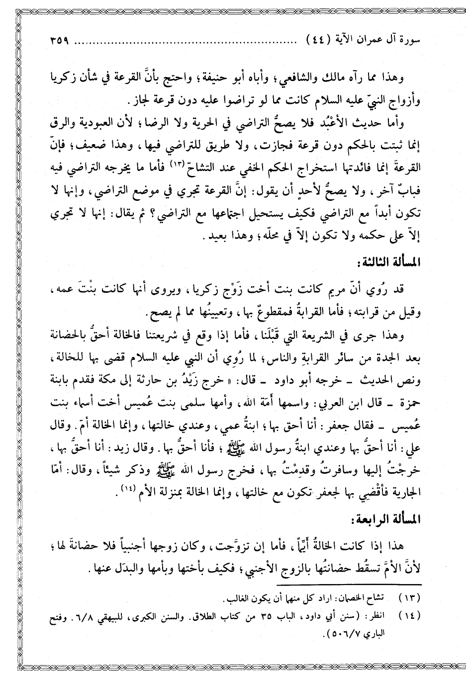 وَهَذَا مِمَّا رَآهُ مَالِكٌ وَالشَّافِعِيُّ، وَأَبَاهُ أَبُو حَنِيفَةَ؛ وَاحْتَجَّ بِأَنَّ الْقُرْعَةَ فِي شَأْنِ زَكَرِيَّا وَأَزْوَاجِ النَّبِيِّ - عَلَيْهِ السَّلَامُ - كَانَتْ مِمَّا لَوْ تَرَاضَوْا عَلَيْهِ دُونَ قُرْعَةٍ لَجَازَ.