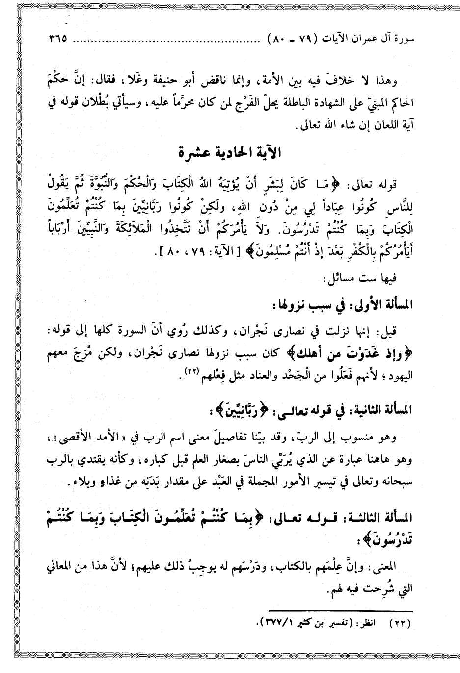 َ ثُمَّ يَقُولَ لِلنَّاسِ كُونُوا عِبَادًا لِي مِنْ دُونِ اللَّهِ وَلَكِنْ كُونُوا رَبَّانِيِّينَ بِمَا كُنْتُمْ تُعَلِّمُونَ الْكِتَابَ وَبِمَا كُنْتُمْ تَدْرُسُونَ} [آل عمران: 79] {وَلا يَأْمُرَكُمْ أَنْ تَتَّخِذُوا الْمَلائِكَةَ وَالنَّبِيِّينَ أَرْبَابًا أَيَأْمُرُكُمْ بِالْكُفْرِ بَعْدَ إِذْ أَنْتُمْ مُسْلِمُونَ} [آل عمران: 80] فِيهَا سِتُّ مَسَائِلَ: