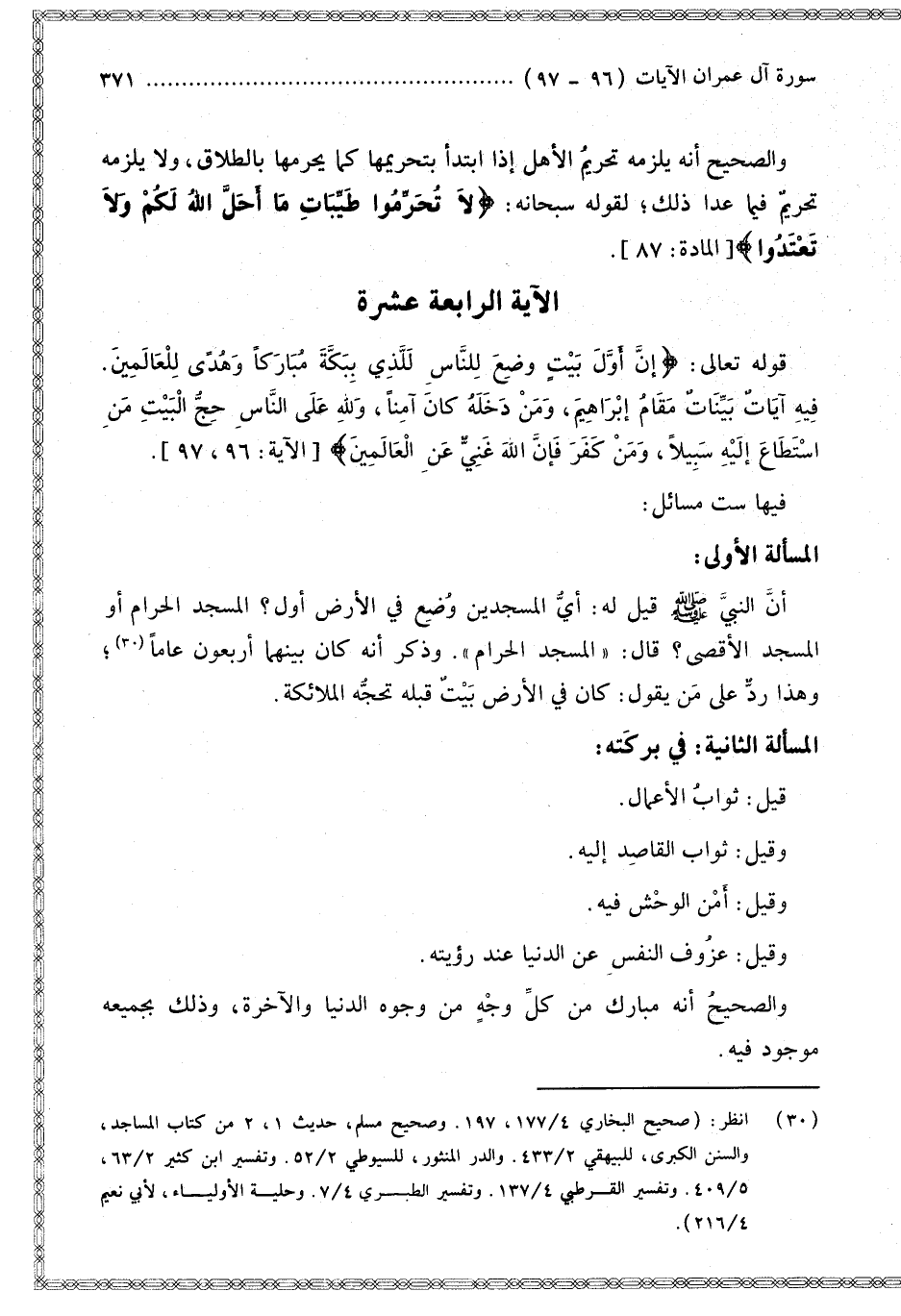َ مُبَارَكًا وَهُدًى لِلْعَالَمِينَ} [آل عمران: 96] {فِيهِ آيَاتٌ بَيِّنَاتٌ مَقَامُ إِبْرَاهِيمَ وَمَنْ دَخَلَهُ كَانَ آمِنًا وَلِلَّهِ عَلَى النَّاسِ حِجُّ الْبَيْتِ مَنِ اسْتَطَاعَ إِلَيْهِ سَبِيلا وَمَنْ كَفَرَ فَإِنَّ اللَّهَ غَنِيٌّ عَنِ الْعَالَمِينَ} [آل عمران: 97] فِيهَا سِتُّ مَسَائِلَ:
