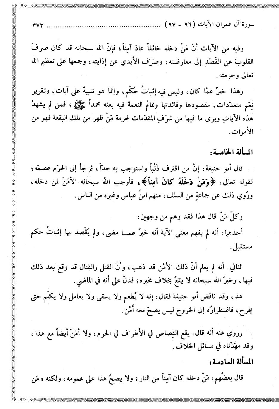 الْمَسْأَلَةُ الْخَامِسَةُ: قَالَ أَبُو حَنِيفَةَ: إنَّ مَنْ اقْتَرَفَ ذَنْبًا وَاسْتَوْجَبَ بِهِ حَدًّا، ثُمَّ لَجَأَ إلَى الْحَرَمِ عَصَمَهُ لِقَوْلِهِ تَعَالَى {وَمَنْ دَخَلَهُ كَانَ آمِنًا} [آل عمران: 97] فَأَوْجَبَ اللَّهُ سُبْحَانَهُ الْأَمْنَ لِمَنْ دَخَلَهُ، وَرُوِيَ ذَلِكَ عَنْ جَمَاعَةٍ مِنْ السَّلَفِ، مِنْهُمْ ابْنُ عَبَّاسٍ وَغَيْرُهُ مِنْ النَّاسِ.