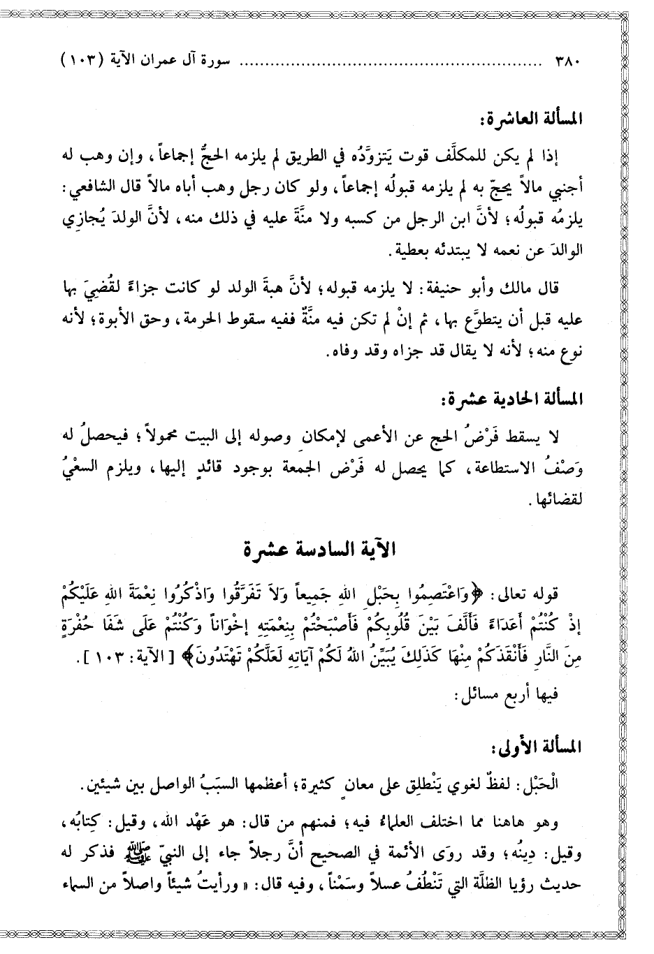 وَلا تَفَرَّقُوا وَاذْكُرُوا نِعْمَتَ اللَّهِ عَلَيْكُمْ إِذْ كُنْتُمْ أَعْدَاءً فَأَلَّفَ بَيْنَ قُلُوبِكُمْ فَأَصْبَحْتُمْ بِنِعْمَتِهِ إِخْوَانًا وَكُنْتُمْ عَلَى شَفَا حُفْرَةٍ مِنَ النَّارِ فَأَنْقَذَكُمْ مِنْهَا كَذَلِكَ يُبَيِّنُ اللَّهُ لَكُمْ آيَاتِهِ لَعَلَّكُمْ تَهْتَدُونَ} [آل عمران: 103] فِيهَا أَرْبَعُ مَسَائِلَ: