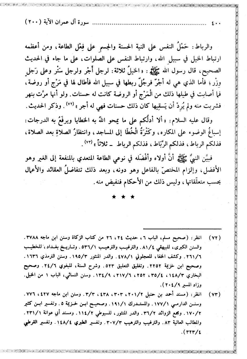 وَالرِّبَاطُ: حَمْلُ النَّفْسِ عَلَى النِّيَّةِ الْحَسَنَةِ وَالْجِسْمِ عَلَى فِعْلِ الطَّاعَةِ، وَمِنْ أَعْظَمِهِ ارْتِبَاطُ الْخَيْلِ فِي سَبِيلِ اللَّهِ، وَارْتِبَاطُ النَّفْسِ عَلَى الصَّلَوَاتِ، عَلَى مَا جَاءَ فِي الْحَدِيثِ الصَّحِيحِ قَالَ رَسُولُ اللَّهِ - صَلَّى اللَّهُ عَلَيْهِ وَسَلَّمَ -: «الْخَيْلُ ثَلَاثَةٌ: لِرَجُلٍ أَجْرٌ وَلِرَجُلٍ سِتْرٌ وَعَلَى رَجُلٍ وِزْرٌ؛ فَأَمَّا الَّذِي هِيَ لَهُ أَجْرٌ فَرَجُلٌ رَبَطَهَا فِي سَبِيلِ اللَّهِ فَأَطَالَ لَهَا فِي مَرْجٍ أَوْ رَوْضَةٍ، فَمَا أَصَابَتْ فِي طِيَلِهَا ذَلِكَ مِنْ الْمَرْجِ أَوْ الرَّوْضَةِ كَانَتْ لَهُ حَسَنَاتٍ. وَلَوْ أَنَّهَا مَرَّتْ بِنَهْرٍ فَشَرِبَتْ مِنْهُ وَلَمْ يُرِدْ أَنْ يَسْقِيَهَا كَانَ ذَلِكَ حَسَنَاتٍ فَهِيَ لَهُ أَجْرٌ». وَذَكَرَ الْحَدِيثَ. وَقَالَ - عَلَيْهِ السَّلَامُ -: «أَلَا أَدُلُّكُمْ عَلَى مَا يَمْحُو اللَّهُ بِهِ الْخَطَايَا وَيَرْفَعُ بِهِ الدَّرَجَاتِ: إسْبَاغُ الْوُضُوءِ عَلَى الْمَكَارِهِ، وَكَثْرَةُ الْخُطَا إلَى الْمَسَاجِدِ، وَانْتِظَارُ الصَّلَاةِ بَعْدَ الصَّلَاةِ، فَذَلِكُمْ الرِّبَاطُ، فَذَلِكُمْ الرِّبَاطُ، فَذَلِكُمْ الرِّبَاطُ ثَلَاثًا». فَبَيَّنَ النَّبِيُّ - صَلَّى اللَّهُ عَلَيْهِ وَسَلَّمَ - أَنَّ أَوْلَاهُ وَأَفْضَلَهُ فِي نَوْعَيْ الطَّاعَةِ الْمُتَعَدِّي بِالْمَنْفَعَةِ إلَى الْغَيْرِ وَهُوَ الْأَفْضَلُ، وَإِلْزَامُ الْمُخْتَصِّ بِالْفَاعِلِ وَهُوَ دُونَهُ، وَبَعْدَ ذَلِكَ تَتَفَاضَلُ الْعَقَائِدُ وَالْأَعْمَالُ بِحَسَبِ مُتَعَلِّقَاتِهَا، وَلَيْسَ ذَلِكَ مِنْ الْأَحْكَامِ فَنَفِيضُ مِنْهُ.