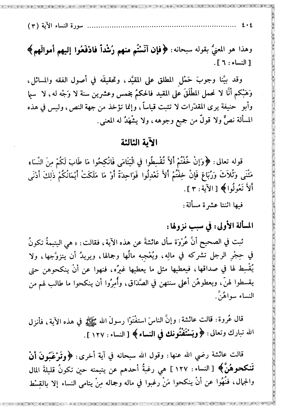 الْمَسْأَلَةُ الْأُولَى: فِي سَبَبِ نُزُولِهَا: ثَبَتَ فِي الصَّحِيحِ أَنَّ عُرْوَةَ سَأَلَ عَائِشَةَ عَنْ هَذِهِ الْآيَةِ، فَقَالَتْ: " هِيَ الْيَتِيمَةُ تَكُونُ فِي حِجْرِ الرَّجُلِ تُشْرِكُهُ فِي مَالِهِ، وَيُعْجِبُهُ مَالُهَا وَجَمَالَهَا، وَيُرِيدُ أَنْ يَتَزَوَّجَهَا، وَلَا يُقْسِطَ لَهَا فِي صَدَاقِهَا، فَيُعْطِيَهَا مِثْلَ مَا يُعْطِيهَا غَيْرُهُ، فَنُهُوا عَنْ أَنْ يَنْكِحُوهُنَّ حَتَّى يُقْسِطُوا لَهُنَّ، وَيُعْطُوهُنَّ أَعْلَى سُنَّتِهِنَّ فِي الصَّدَاقِ، وَأُمِرُوا أَنْ يَنْكِحُوا مَا طَابَ لَهُمْ مِنْ النِّسَاءِ سِوَاهُنَّ. قَالَ عُرْوَةُ: قَالَتْ عَائِشَةُ: «وَإِنَّ النَّاسَ اسْتَفْتَوْا رَسُولَ اللَّهِ - صَلَّى اللَّهُ عَلَيْهِ وَسَلَّمَ - فِي هَذِهِ الْآيَةِ، فَأَنْزَلَ اللَّهُ تَبَارَكَ وَتَعَالَى: {وَيَسْتَفْتُونَكَ فِي النِّسَاءِ} [النساء: 127]» قَالَتْ عَائِشَةُ - رَضِيَ اللَّهُ عَنْهَا -: وَقَوْلُ اللَّهِ سُبْحَانَهُ فِي آيَةٍ أُخْرَى: {وَتَرْغَبُونَ أَنْ تَنْكِحُوهُنَّ} [النساء: 127] هِيَ رَغْبَةُ أَحَدِهِمْ عَنْ يَتِيمَتِهِ حِينَ تَكُونُ قَلِيلَةَ الْمَالِ وَالْجَمَالِ، فَنُهُوا عَنْ أَنْ يَنْكِحُوا مَنْ رَغِبُوا فِي مَالِهِ وَجَمَالِهِ مِنْ يَتَامَى النِّسَاءِ إلَّا بِالْقِسْطِ