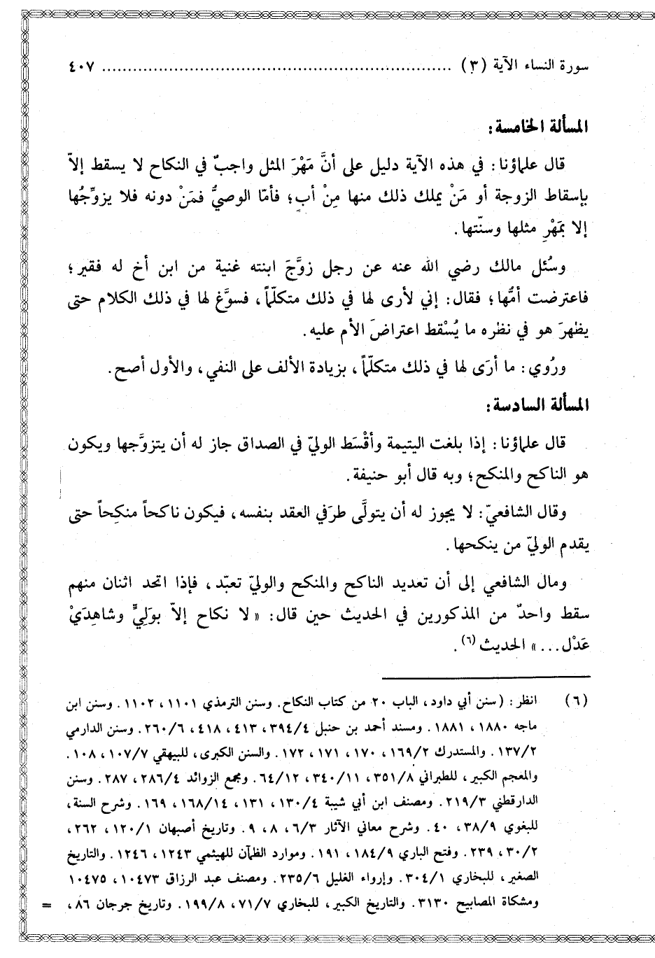 الْمَسْأَلَةُ الْخَامِسَةُ: قَالَ عُلَمَاؤُنَا: فِي هَذِهِ الْآيَةِ دَلِيلٌ عَلَى أَنَّ مَهْرَ الْمِثْلِ وَاجِبٌ فِي النِّكَاحِ لَا يَسْقُطُ إلَّا بِإِسْقَاطِ الزَّوْجَةِ أَوْ مَنْ يَمْلِكُ ذَلِكَ مِنْهَا مِنْ أَبٍ؛ فَأَمَّا الْوَصِيُّ فَمَنْ دُونَهُ فَلَا يُزَوِّجُهَا إلَّا بِمَهْرِ مِثْلِهَا وَسُنَّتِهَا. وَسُئِلَ مَالِكٌ - رَضِيَ اللَّهُ عَنْهُ - عَنْ رَجُلٍ زَوَّجَ ابْنَتَهُ غَنِيَّةً مِنْ ابْنِ أَخٍ لَهُ فَقِيرٍ؛ فَاعْتَرَضَتْ أُمُّهَا؛ فَقَالَ: إنِّي لَأَرَى لَهَا فِي ذَلِكَ مُتَكَلِّمًا، فَسَوَّغَ لَهَا فِي ذَلِكَ الْكَلَامِ حَتَّى يُظْهِرَ هُوَ فِي نَظَرِهِ مَا يُسْقِطُ اعْتِرَاضَ الْأُمِّ عَلَيْهِ. وَرُوِيَ: مَا أَرَى لَهَا فِي ذَلِكَ مُتَكَلِّمًا، بِزِيَادَةِ الْأَلْفِ عَلَى النَّفْيِ، وَالْأَوَّلُ أَصَحُّ.
