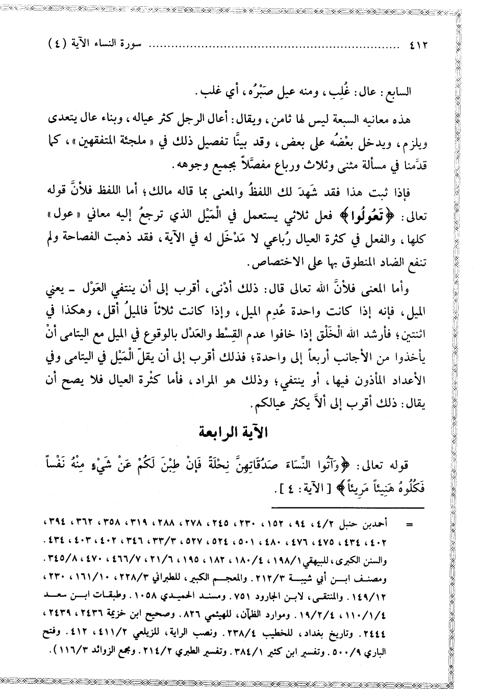 وَأَمَّا الْمَعْنَى فَلِأَنَّ اللَّهَ تَعَالَى قَالَ: ذَلِكَ أَدْنَى، أَقْرَبُ إلَى أَنْ يَنْتَفِيَ الْعَوْلَ يَعْنِي الْمَيْلَ، فَإِنَّهُ إذَا كَانَتْ وَاحِدَةً عُدِمَ الْمَيْلُ، وَإِذَا كَانَتْ ثَلَاثًا فَالْمَيْلُ أَقَلُّ، وَهَكَذَا فِي اثْنَتَيْنِ؛ فَأَرْشَدَ اللَّهُ الْخَلْقَ إذَا خَافُوا عَدَمَ الْقِسْطِ وَالْعَدْلِ بِالْوُقُوعِ فِي الْمَيْلِ مَعَ الْيَتَامَى أَنْ يَأْخُذُوا مِنْ الْأَجَانِبِ أَرْبَعًا إلَى وَاحِدَةٍ؛ فَذَلِكَ أَقْرَبُ إلَى أَنْ يَقِلَّ الْمَيْلَ فِي الْيَتَامَى وَفِي الْأَعْدَادِ الْمَأْذُونِ فِيهَا، أَوْ يَنْتَفِيَ؛ وَذَلِكَ هُوَ الْمُرَادُ، فَأَمَّا كَثْرَةُ الْعِيَالِ فَلَا يَصِحُّ أَنْ يُقَالَ: ذَلِكَ أَقْرَبُ إلَى أَلَّا يَكْثُرَ عِيَالُكُمْ.