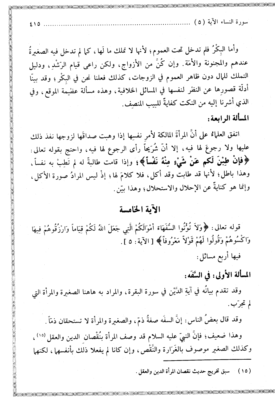 الْمَسْأَلَةُ الْأُولَى: فِي السَّفَهِ: وَقَدْ تَقَدَّمَ بَيَانُهُ فِي آيَةِ الدَّيْنِ فِي سُورَةِ الْبَقَرَةِ، وَالْمُرَادُ بِهِ هَاهُنَا الصَّغِيرَةُ وَالْمَرْأَةُ الَّتِي لَمْ تُجَرَّبْ. وَقَدْ قَالَ بَعْضُ النَّاسِ: إنَّ السَّفَهَ صِفَةُ ذَمٍّ، وَالصَّغِيرَةُ وَالْمَرْأَةُ لَا تَسْتَحِقَّانِ ذَمًّا. وَهَذَا ضَعِيفٌ؛ فَإِنَّ النَّبِيَّ - عَلَيْهِ السَّلَامُ - قَدْ وَصَفَ الْمَرْأَةَ بِنُقْصَانِ الدِّينِ وَالْعَقْلِ، وَكَذَلِكَ الصَّغِيرُ مَوْصُوفٌ بِالْغِرَارَةِ وَالنَّقْصِ، وَإِنْ كَانَا لَمْ يَفْعَلَا ذَلِكَ بِأَنْفُسِهِمَا، لَكِنَّهُمَا