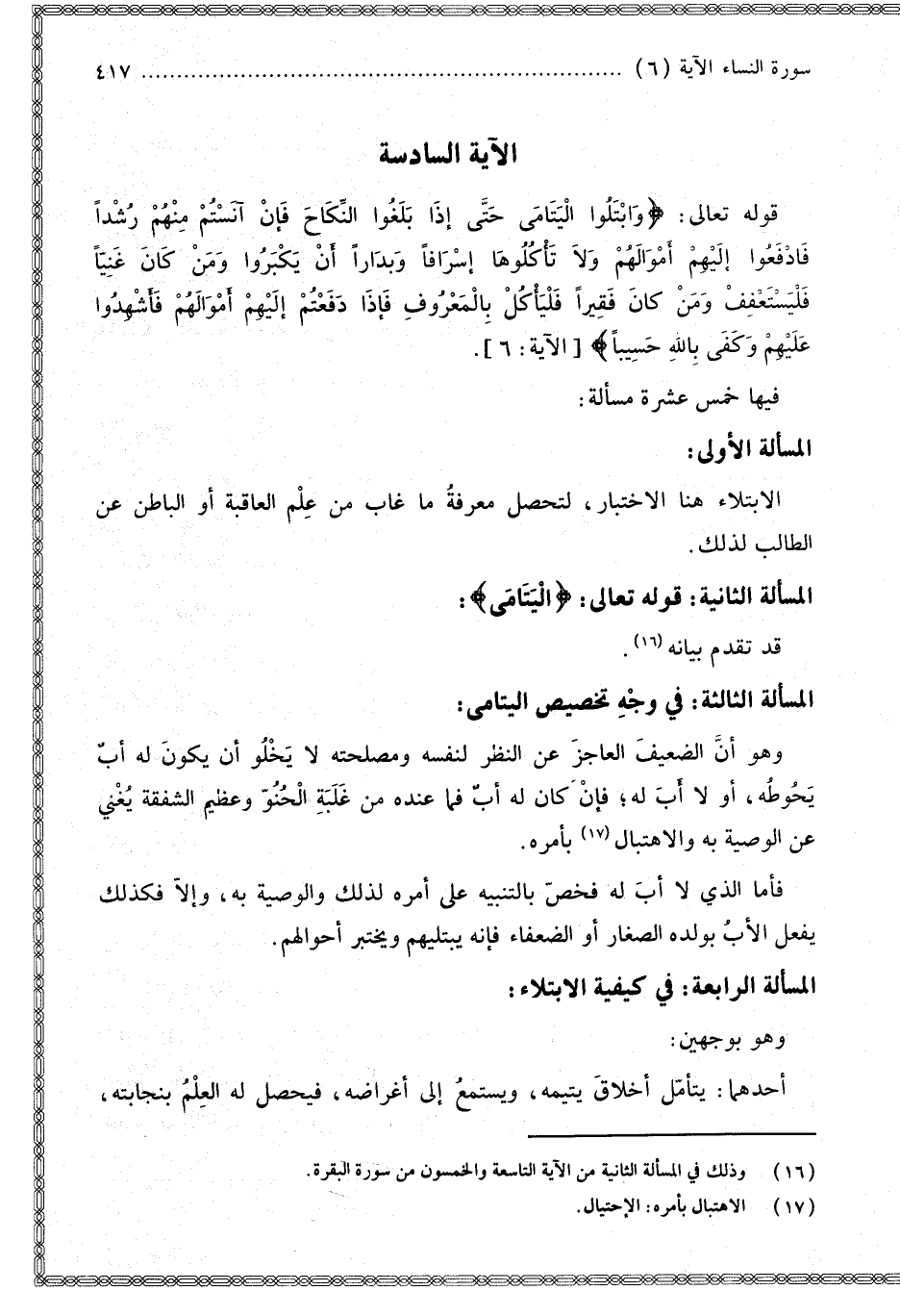 َ فَإِنْ آنَسْتُمْ مِنْهُمْ رُشْدًا فَادْفَعُوا إِلَيْهِمْ أَمْوَالَهُمْ وَلا تَأْكُلُوهَا إِسْرَافًا وَبِدَارًا أَنْ يَكْبَرُوا وَمَنْ كَانَ غَنِيًّا فَلْيَسْتَعْفِفْ وَمَنْ كَانَ فَقِيرًا فَلْيَأْكُلْ بِالْمَعْرُوفِ فَإِذَا دَفَعْتُمْ إِلَيْهِمْ أَمْوَالَهُمْ فَأَشْهِدُوا عَلَيْهِمْ وَكَفَى بِاللَّهِ حَسِيبًا} [النساء: 6] فِيهَا خَمْسَ عَشْرَةَ مَسْأَلَةً:
