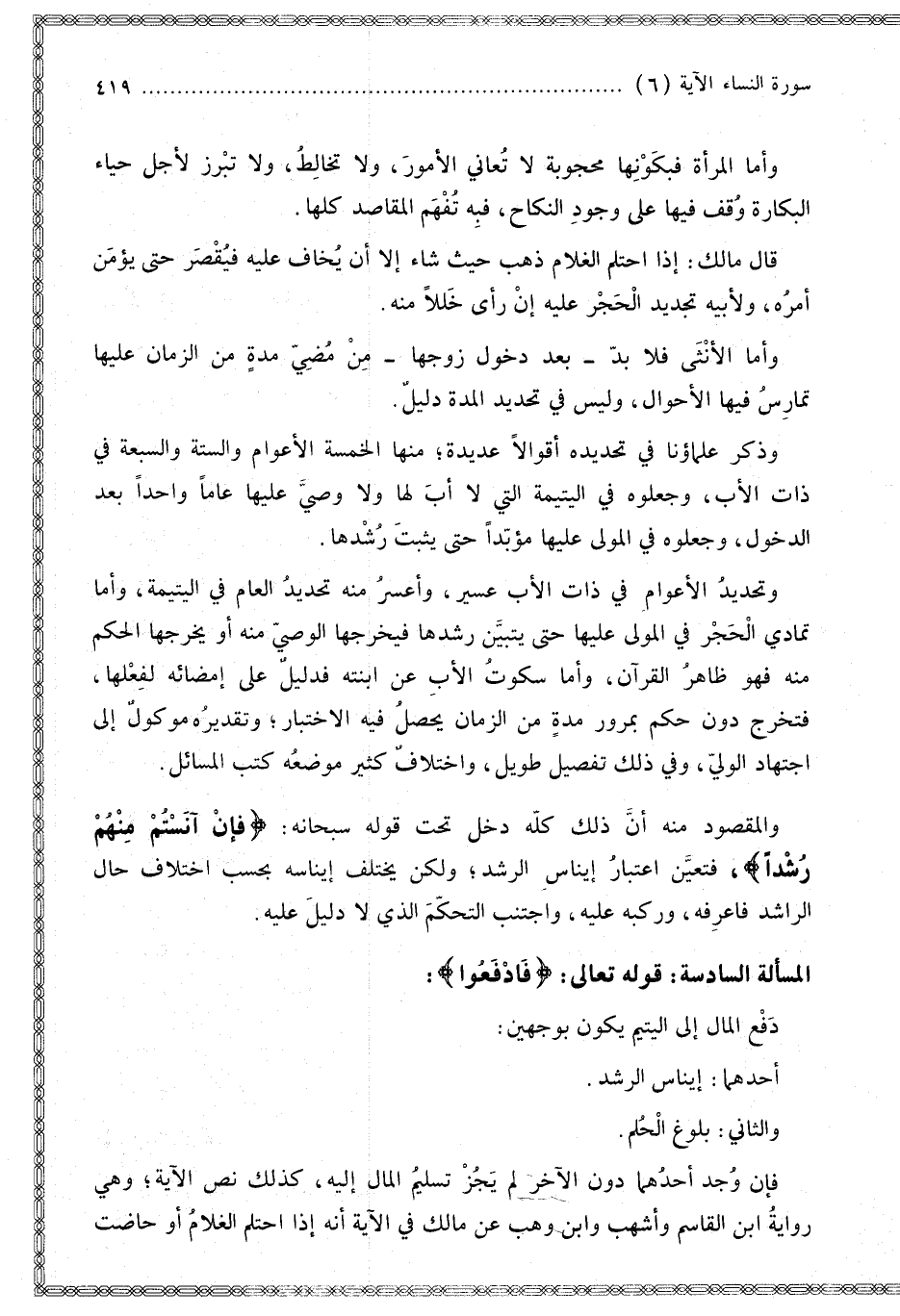 وَتَحْدِيدُ الْأَعْوَامِ فِي ذَاتِ الْأَبِ عَسِيرٌ، وَأَعْسَرُ مِنْهُ تَحْدِيدُ الْعَامِ فِي الْيَتِيمَةِ، وَأَمَّا تَمَادِي الْحَجْرِ فِي الْمُوَلَّى عَلَيْهَا حَتَّى يَتَبَيَّنَ رُشْدُهَا فَيُخْرِجَهَا الْوَصِيُّ مِنْهُ أَوْ يُخْرِجَهَا الْحُكْمُ مِنْهُ فَهُوَ ظَاهِرُ الْقُرْآنِ، وَأَمَّا سُكُوتُ الْأَبِ عَنْ ابْنَتِهِ فَدَلِيلٌ عَلَى إمْضَائِهِ لِفِعْلِهَا، فَتَخْرُجُ دُونَ حُكْمٍ بِمُرُورِ مُدَّةٍ مِنْ الزَّمَانِ يَحْصُلُ فِيهِ الِاخْتِبَارُ؛ وَتَقْدِيرُهُ مَوْكُولٌ إلَى اجْتِهَادِ الْوَلِيِّ، وَفِي ذَلِكَ تَفْصِيلٌ طَوِيلٌ، وَاخْتِلَافٌ كَثِيرٌ مَوْضِعُهُ كُتُبُ الْمَسَائِلِ. وَالْمَقْصُودُ مِنْهُ أَنَّ ذَلِكَ كُلَّهُ دَخَلَ تَحْتَ قَوْلِهِ سُبْحَانَهُ: {فَإِنْ آنَسْتُمْ مِنْهُمْ رُشْدًا} [النساء: 6] فَتَعَيَّنَ اعْتِبَارُ إينَاسِ الرُّشْدِ؛ وَلَكِنْ يَخْتَلِفُ إينَاسُهُ بِحَسَبِ اخْتِلَافِ حَالِ الرَّاشِدِ فَاعْرِفْهُ، وَرَكِّبْهُ عَلَيْهِ، وَاجْتَنِبْ التَّحَكُّمَ الَّذِي لَا دَلِيلَ عَلَيْهِ.