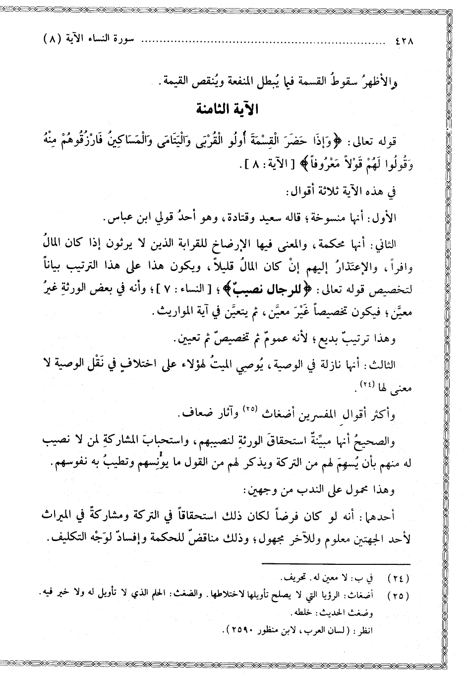 الْآيَةُ الثَّامِنَةُ: {وَإِذَا حَضَرَ الْقِسْمَةَ أُولُو الْقُرْبَى وَالْيَتَامَى وَالْمَسَاكِينُ فَارْزُقُوهُمْ مِنْهُ وَقُولُوا لَهُمْ قَوْلا مَعْرُوفًا} [النساء: 8] فِي هَذِهِ الْآيَةِ ثَلَاثَةُ أَقْوَالٍ: الْأَوَّلُ: أَنَّهَا مَنْسُوخَةٌ؛ قَالَهُ سَعِيدٌ وَقَتَادَةُ، وَهُوَ أَحَدُ قَوْلَيْ ابْنِ عَبَّاسٍ.