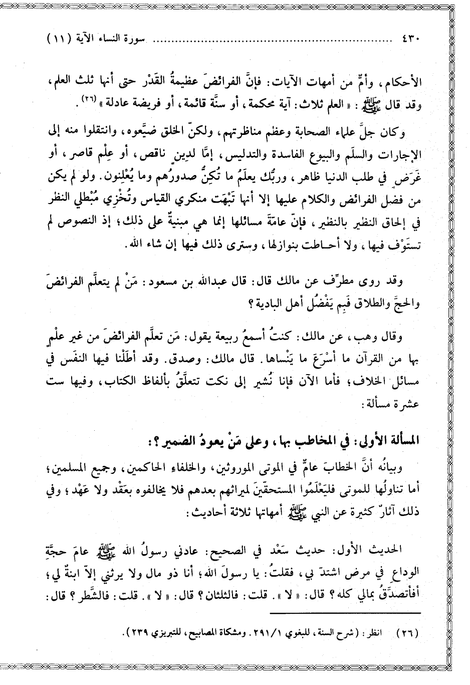 الْأَحْكَامِ، وَأُمٌّ مِنْ أُمَّهَاتِ الْآيَاتِ: فَإِنَّ الْفَرَائِضَ عَظِيمَةُ الْقَدْرِ حَتَّى إنَّهَا ثُلُثُ الْعِلْمِ، وَقَدْ قَالَ - صَلَّى اللَّهُ عَلَيْهِ وَسَلَّمَ -: «الْعِلْمُ ثَلَاثٌ: آيَةٌ مُحْكَمَةٌ، أَوْ سُنَّةٌ قَائِمَةٌ، أَوْ فَرِيضَةٌ عَادِلَةٌ».