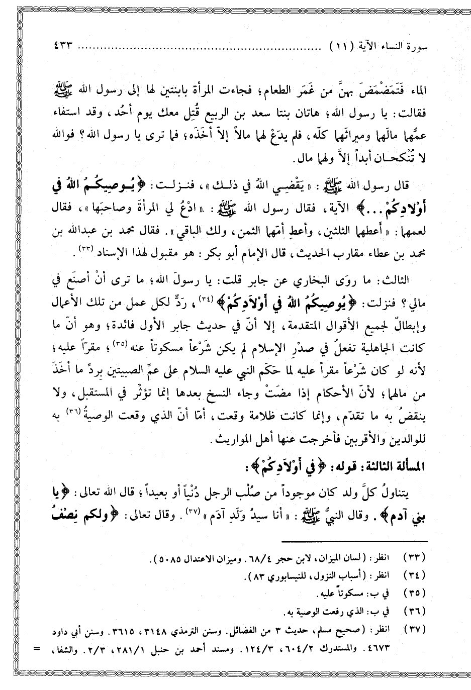 الثَّالِثُ: مَا رَوَى الْبُخَارِيُّ عَنْ جَابِرٍ «قُلْت: يَا رَسُولَ اللَّهِ؛ مَا تَرَى أَنْ أَصْنَعَ فِي مَالِي؟ فَنَزَلَتْ: {يُوصِيكُمُ اللَّهُ فِي أَوْلادِكُمْ} [النساء: 11]» رَدٌّ لِكُلِّ عَمَلٍ مِنْ تِلْكَ الْأَعْمَالِ وَإِبْطَالٌ لِجَمِيعِ الْأَقْوَالِ الْمُتَقَدِّمَةِ، إلَّا أَنَّ فِي حَدِيثِ جَابِرٍ الْأَوَّلِ فَائِدَةً؛ وَهُوَ أَنَّ مَا كَانَتْ الْجَاهِلِيَّةُ تَفْعَلُ فِي صَدْرِ الْإِسْلَامِ لَمْ يَكُنْ شَرْعًا مَسْكُوتًا عَنْهُ؛ مُقَرًّا عَلَيْهِ؛ لِأَنَّهُ لَوْ كَانَ شَرْعًا مُقَرًّا عَلَيْهِ لَمَا حَكَمَ النَّبِيُّ - عَلَيْهِ السَّلَامُ - عَلَى عَمِّ الصَّبِيَّتَيْنِ بِرَدِّ مَا أَخَذَ مِنْ مَالِهِمَا؛ لِأَنَّ الْأَحْكَامَ إذَا مَضَتْ وَجَاءَ النَّسْخُ بَعْدَهَا إنَّمَا تُؤَثِّرُ فِي الْمُسْتَقْبِلِ، وَلَا يُنْقَضُ بِهِ مَا تَقَدَّمَ، وَإِنَّمَا كَانَتْ ظُلَامَةٌ وَقَعَتْ، أَمَّا أَنَّ الَّذِي وَقَعَتْ الْوَصِيَّةُ بِهِ لِلْوَالِدَيْنِ وَالْأَقْرَبِينَ فَأُخْرِجَتْ عَنْهَا أَهْلُ الْمَوَارِيثِ.
