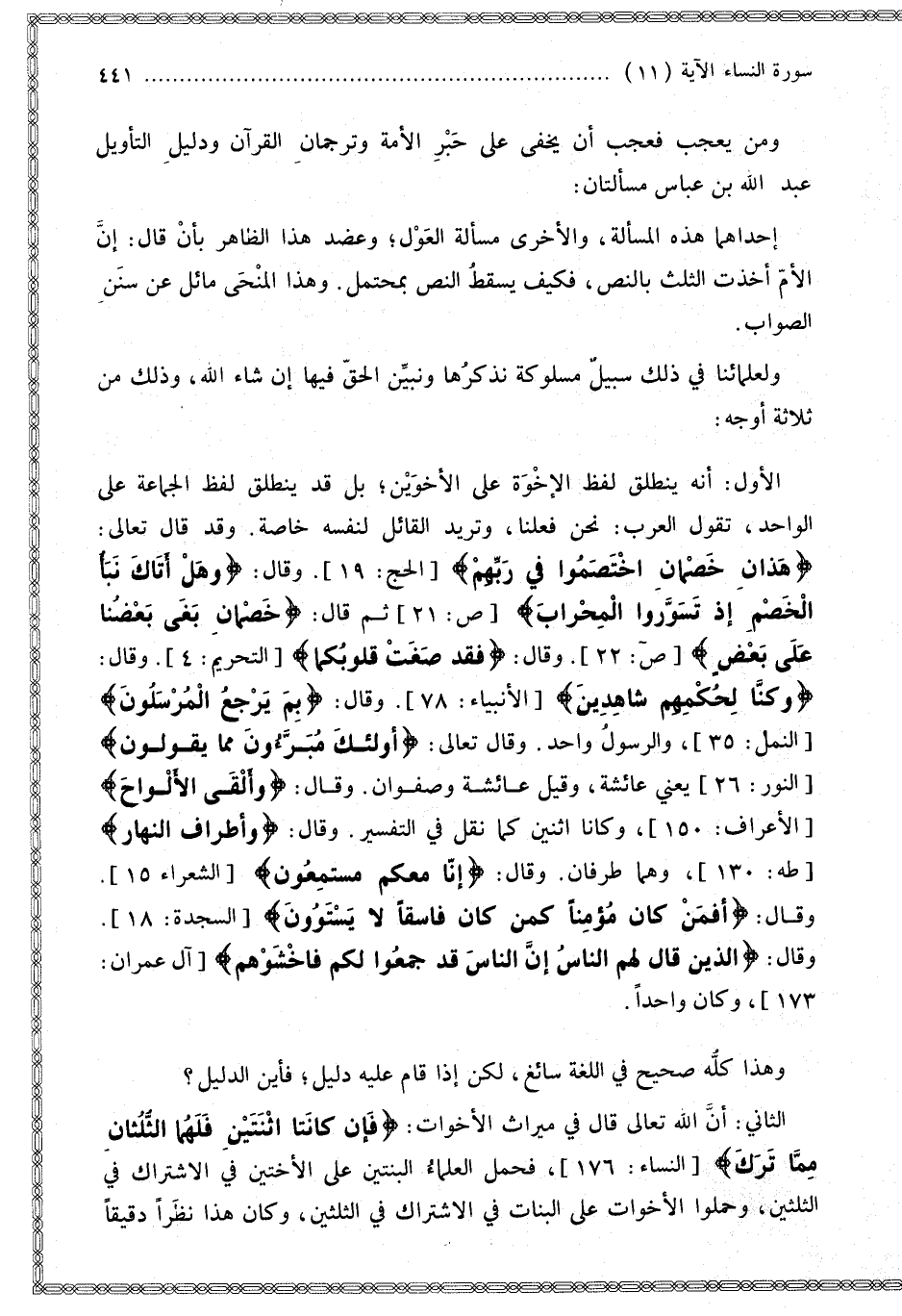 وَمَنْ يَعْجَبُ فَعَجَبٌ أَنْ يَخْفَى عَلَى حَبْرِ الْأُمَّةِ وَتُرْجَمَانِ الْقُرْآنِ وَدَلِيلِ التَّأْوِيلِ عَبْدِ اللَّهِ بْنِ عَبَّاسٍ مَسْأَلَتَانِ: إحْدَاهُمَا هَذِهِ الْمَسْأَلَةُ، وَالْأُخْرَى مَسْأَلَةُ الْعَوْلِ؛ وَعَضَّدَ هَذَا الظَّاهِرَ بِأَنْ قَالَ: إنَّ الْأُمَّ أَخَذَتْ الثُّلُثَ بِالنَّصِّ، فَكَيْف يَسْقُطُ النَّصُّ بِمُحْتَمَلٍ. وَهَذَا الْمَنْحَى مَائِلٌ عَنْ سُنَنِ الصَّوَابِ. وَلِعُلَمَائِنَا فِي ذَلِكَ سَبِيلٌ مَسْلُوكَةٌ نَذْكُرُهَا وَنُبَيِّنُ الْحَقُّ فِيهَا إنْ شَاءَ اللَّهُ، وَذَلِكَ مِنْ ثَلَاثَةِ أَوْجُهٍ: الْأَوَّلُ: أَنَّهُ يَنْطَلِقُ لَفْظُ الْإِخْوَةِ عَلَى الْأَخَوَيْنِ؛ بَلْ قَدْ يَنْطَلِقُ لَفْظُ الْجَمَاعَةِ عَلَى الْوَاحِدِ، تَقُولُ الْعَرَبُ: نَحْنُ فَعَلْنَا، وَتُرِيدُ الْقَائِلُ لِنَفْسِهِ خَاصَّةً.