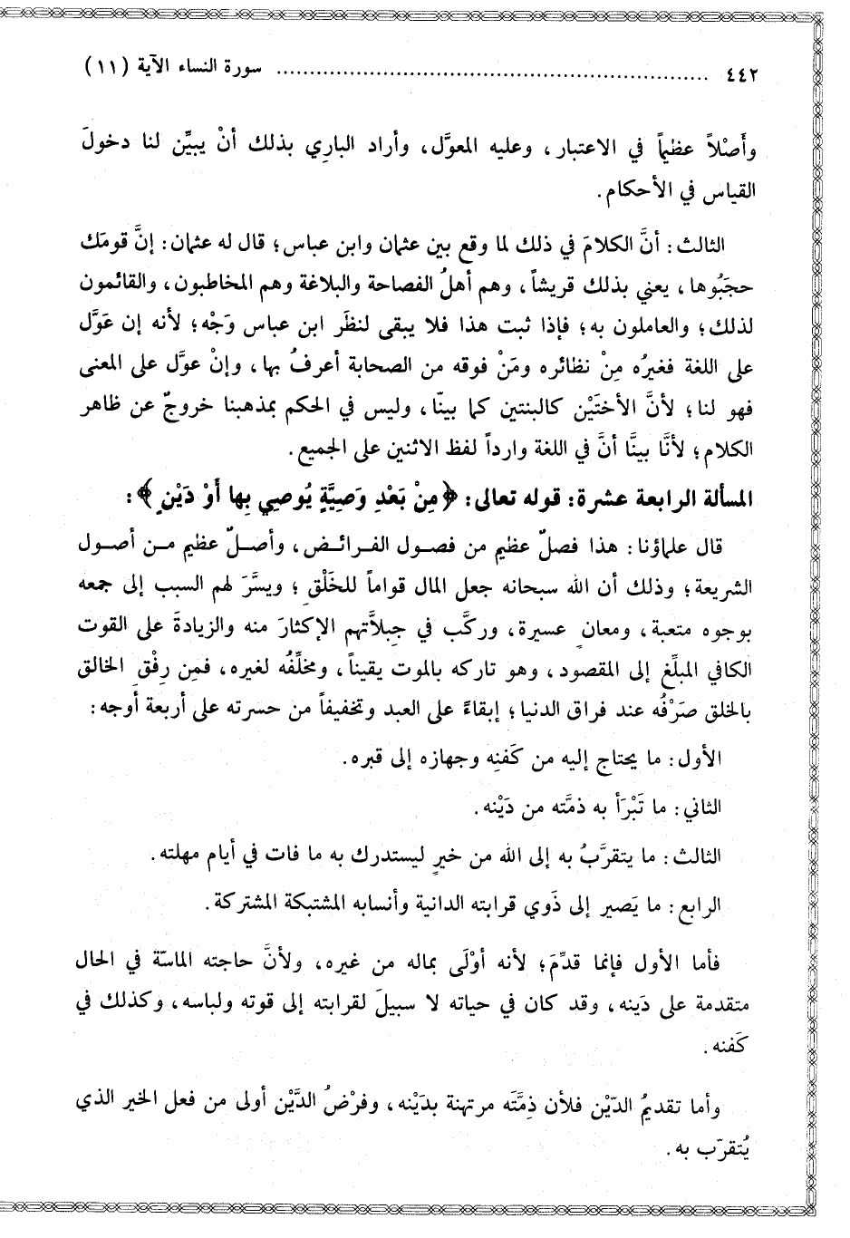 الْمَسْأَلَةُ الرَّابِعَةَ عَشْرَةَ: قَوْله تَعَالَى: {مِنْ بَعْدِ وَصِيَّةٍ يُوصِي بِهَا أَوْ دَيْنٍ} [النساء: 11] قَالَ عُلَمَاؤُنَا: هَذَا فَصْلٌ عَظِيمٌ مِنْ فُصُولِ الْفَرَائِضِ، وَأَصْلٌ عَظِيمٌ مِنْ أُصُولِ الشَّرِيعَةِ؛ وَذَلِكَ أَنَّ اللَّهَ سُبْحَانَهُ جَعَلَ الْمَالَ قِوَامًا لِلْخَلْقِ؛ وَيَسَّرَ لَهُمْ السَّبَبَ إلَى جَمْعِهِ بِوُجُوهٍ مُتْعَبَةٍ، وَمَعَانٍ عَسِيرَةٍ، وَرَكَّبَ فِي جِبِلَّاتِهِمْ الْإِكْثَارَ مِنْهُ وَالزِّيَادَةَ عَلَى الْقُوتِ الْكَافِي الْمُبَلِّغِ إلَى الْمَقْصُودِ، وَهُوَ تَارِكُهُ بِالْمَوْتِ يَقِينًا، وَمُخَلِّفُهُ لِغَيْرِهِ، فَمِنْ رِفْقِ الْخَالِقِ بِالْخَلْقِ صَرْفُهُ عِنْدَ فِرَاقِ الدُّنْيَا؛ إبْقَاءً عَلَى الْعَبْدِ وَتَخْفِيفًا مِنْ حَسْرَتِهِ عَلَى أَرْبَعَةِ أَوْجُهٍ: الْأَوَّلُ: مَا يَحْتَاجُ إلَيْهِ مِنْ كَفَنِهِ وَجِهَازِهِ إلَى قَبْرِهِ. الثَّانِي: مَا تَبْرَأُ بِهِ ذِمَّتُهُ مِنْ دَيْنِهِ. الثَّالِثُ: مَا يَتَقَرَّبُ بِهِ إلَى اللَّهِ مِنْ خَيْرٍ لِيَسْتَدْرِكَ بِهِ مَا فَاتَ فِي أَيَّامِ مُهْلَتِهِ. الرَّابِعُ: مَا يَصِيرُ إلَى ذَوِي قَرَابَتِهِ الدَّانِيَةِ وَأَنْسَابِهِ الْمُشْتَبِكَةِ الْمُشْتَرَكَةِ. فَأَمَّا الْأَوَّلُ فَإِنَّمَا قَدِمَ؛ لِأَنَّهُ أَوْلَى بِمَالِهِ مِنْ غَيْرِهِ، وَلِأَنَّ حَاجَتَهُ الْمَاسَةَ فِي الْحَالِ مُتَقَدِّمَةٌ عَلَى دَيْنِهِ، وَقَدْ كَانَ فِي حَيَاتِهِ لَا سَبِيلَ لِقَرَابَتِهِ إلَى قُوتِهِ وَلِبَاسِهِ، وَكَذَلِكَ فِي كَفَنِهِ.