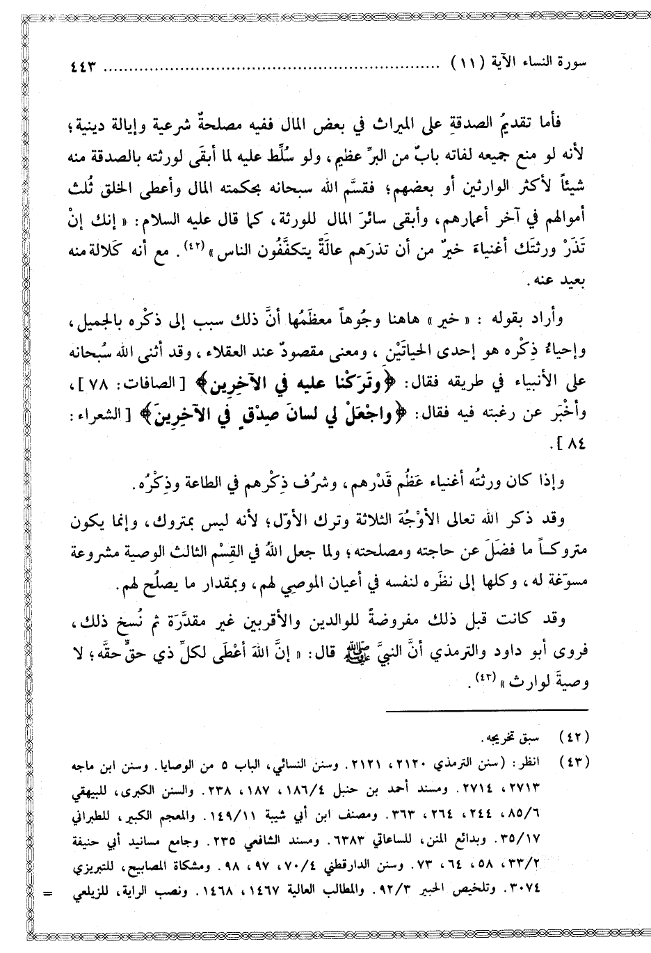 وَإِذَا كَانَ وَرَثَتُهُ أَغْنِيَاءَ عَظُمَ قَدْرُهُمْ، وَشَرُفَ ذِكْرُهُمْ فِي الطَّاعَةِ وَذِكْرُهُ. وَقَدْ ذَكَرَ اللَّهُ تَعَالَى الْأَوْجُهَ الثَّلَاثَةَ وَتَرَكَ الْأَوَّلَ؛ لِأَنَّهُ لَيْسَ بِمَتْرُوكٍ، وَإِنَّمَا يَكُونُ مَتْرُوكًا مَا فَضَلَ عَنْ حَاجَتِهِ وَمَصْلَحَتِهِ؛ وَلَمَّا جَعَلَ اللَّهُ فِي الْقِسْمِ الثَّالِثِ الْوَصِيَّةَ مَشْرُوعَةً مَسُوغَةً لَهُ، وَكَّلَهَا إلَى نَظَرِهِ لِنَفْسِهِ فِي أَعْيَانِ الْمُوصِي لَهُمْ، وَبِمِقْدَارِ مَا يَصْلُحُ لَهُمْ. وَقَدْ كَانَتْ قَبْلَ ذَلِكَ مَفْرُوضَةً لِلْوَالِدَيْنِ وَالْأَقْرَبِينَ غَيْرَ مُقَدَّرَةٍ ثُمَّ نُسِخَ ذَلِكَ، فَرَوَى أَبُو دَاوُد وَالتِّرْمِذِيُّ أَنَّ النَّبِيَّ - صَلَّى اللَّهُ عَلَيْهِ وَسَلَّمَ - قَالَ: «إنَّ اللَّهَ أَعْطَى لِكُلِّ ذِي حَقٍّ حَقَّهُ؛ لَا وَصِيَّةَ لِوَارِثٍ».