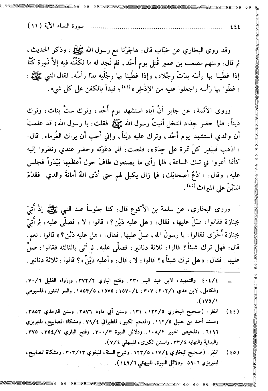 وَرَوَى الْأَئِمَّةُ، «عَنْ جَابِرٍ أَنَّ أَبَاهُ اُسْتُشْهِدَ يَوْمَ أُحُدٍ، وَتَرَكَ سِتَّ بَنَاتٍ، وَتَرَكَ دَيْنًا، فَلَمَّا حَضَرَ جِدَادُ النَّخْلِ أَتَيْت رَسُولَ اللَّهِ - صَلَّى اللَّهُ عَلَيْهِ وَسَلَّمَ - فَقُلْت: يَا رَسُولَ اللَّهِ؛ قَدْ عَلِمْت أَنَّ وَالِدِي اُسْتُشْهِدَ يَوْمَ أُحُدٍ، وَتَرَكَ عَلَيْهِ دَيْنًا، وَإِنِّي أُحِبُّ أَنْ يَرَاكَ الْغُرَمَاءُ. قَالَ: اذْهَبْ فَبَيْدِرْ كُلَّ تَمْرَةٍ عَلَى حِدَةٍ فَفَعَلْت: فَلَمَّا دَعَوْتُهُ وَحَضَرَ عِنْدِي وَنَظَرُوا إلَيْهِ كَأَنَّمَا أُغْرُوا بِي تِلْكَ السَّاعَةَ، فَلَمَّا رَأَى مَا يَصْنَعُونَ طَافَ حَوْلَ أَعْظَمِهَا بَيْدَرًا فَجَلَسَ عَلَيْهِ، وَقَالَ: اُدْعُ أَصْحَابَكَ؛ فَمَا زَالَ يَكِيلُ لَهُمْ حَتَّى أَدَّى اللَّهُ أَمَانَةَ وَالِدِي». فَقَدَّمَ الدَّيْنَ عَلَى الْمِيرَاثِ. وَرَوَى الْبُخَارِيُّ، عَنْ سَلَمَةَ بْنِ الْأَكْوَعِ قَالَ: «كُنَّا جُلُوسًا عِنْدَ النَّبِيِّ - صَلَّى اللَّهُ عَلَيْهِ وَسَلَّمَ - إذْ أُتِيَ بِجِنَازَةٍ فَقَالُوا: صَلِّ عَلَيْهَا، فَقَالَ: هَلْ عَلَيْهِ دَيْنٌ؟ قَالُوا: لَا، فَصَلَّى عَلَيْهِ، ثُمَّ أُتِيَ بِجِنَازَةٍ أُخْرَى فَقَالُوا: يَا رَسُولَ اللَّهِ، صَلِّ عَلَيْهَا. فَقَالَ: هَلْ عَلَيْهِ دَيْنٌ؟ قَالُوا: نَعَمْ. قَالَ: فَهَلْ تَرَكَ شَيْئًا؟ قَالُوا: ثَلَاثَةَ دَنَانِيرَ، فَصَلَّى عَلَيْهِ. ثُمَّ أُتِيَ بِالثَّالِثَةِ فَقَالُوا: صَلِّ عَلَيْهَا. فَقَالَ: هَلْ تَرَكَ شَيْئًا؟ قَالُوا: لَا، قَالَ: أَعَلَيْهِ دَيْنٌ؟ قَالُوا: ثَلَاثَةُ دَنَانِيرَ.