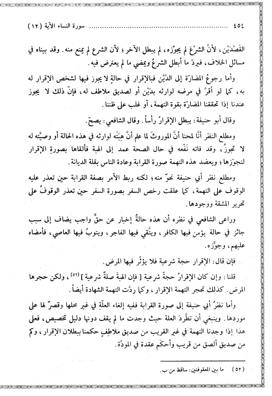 وَرَاعَى الشَّافِعِيُّ فِي نَظَرِهِ أَنَّ هَذِهِ حَالَةُ إخْبَارٍ عَنْ حَقٍّ وَاجِبٍ يُضَافُ إلَى سَبَبٍ جَائِزٍ فِي حَالَةٍ يُؤْمِنُ فِيهَا الْكَافِرُ، وَيَتَّقِي فِيهَا الْفَاجِرُ، وَيَتُوبُ فِيهَا الْعَاصِي، فَأَمْضَاهُ عَلَيْهِمْ، وَجَوَّزَهُ. فَإِنْ قَالَ: الْإِقْرَارُ حُجَّةٌ شَرْعِيَّةٌ فَلَا يُؤَثِّرُ فِيهَا الْمَرَضُ. قُلْنَا: وَإِنْ كَانَ الْإِقْرَارُ حُجَّةً شَرْعِيَّةً [فَإِنَّ الْهِبَةَ صِلَةٌ شَرْعِيَّةٌ]، وَلَكِنْ حَجَرَهَا الْمَرَضُ. كَذَلِكَ تَحْجُرُ التُّهْمَةُ الْإِقْرَارَ، وَكَمَا رَدَّتْ التُّهْمَةُ الشَّهَادَةَ أَيْضًا.
