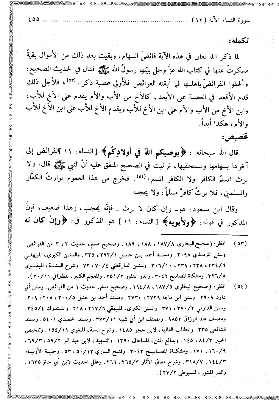 تَكْمِلَةٌ: لَمَّا ذَكَرَ اللَّهُ تَعَالَى فِي هَذِهِ الْآيَةِ فَائِضَ السِّهَامِ، وَبَقِيَتْ بَعْدَ ذَلِكَ مِنْ الْأَمْوَالِ بَقِيَّةٌ مَسْكُوتٌ عَنْهَا فِي كِتَابِ اللَّهِ عَزَّ وَجَلَّ بَيَّنَهَا رَسُولُ اللَّهِ - صَلَّى اللَّهُ عَلَيْهِ وَسَلَّمَ - فَقَالَ فِي الْحَدِيثِ الصَّحِيحِ: «أَلْحِقُوا الْفَرَائِضَ بِأَهْلِهَا فَمَا أَبْقَتْهُ الْفَرَائِضُ فَلِأَوْلَى عَصَبَةٍ ذَكَرٍ»؛ فَلِأَجْلِ ذَلِكَ قُدِّمَ الْأَقْرَبُ فِي الْعَصَبَةِ عَلَى الْأَبْعَدِ، كَالْأَخِ مِنْ الْأَبِ وَالْأُمِّ يُقَدَّمُ عَلَى الْأَخِ لِلْأَبِ، وَابْنِ الْأَخِ مِنْ الْأَبِ وَالْأُمِّ عَلَى ابْنِ الْأَخِ لِلْأَبِ وَيُقَدَّمُ الْأَخُ لِلْأَبِ عَلَى ابْنِ الْأَخِ لِلْأَبِ وَالْأُمِّ، هَكَذَا أَبَدًا.