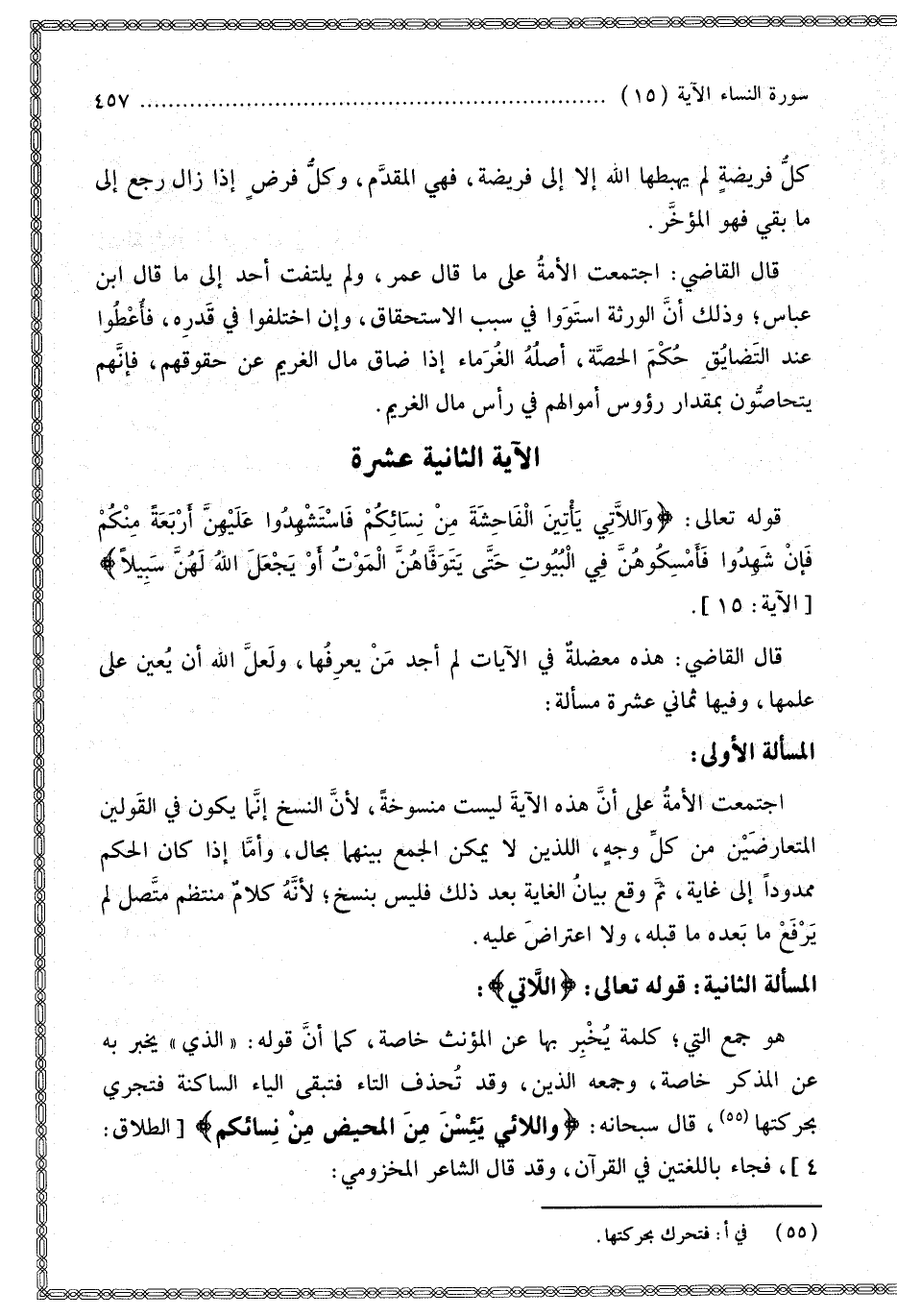 ْ فَاسْتَشْهِدُوا عَلَيْهِنَّ أَرْبَعَةً مِنْكُمْ فَإِنْ شَهِدُوا فَأَمْسِكُوهُنَّ فِي الْبُيُوتِ حَتَّى يَتَوَفَّاهُنَّ الْمَوْتُ أَوْ يَجْعَلَ اللَّهُ لَهُنَّ سَبِيلا} [النساء: 15] قَالَ الْقَاضِي: هَذِهِ مُعْضِلَةٌ فِي الْآيَاتِ لَمْ أَجِدْ مَنْ يَعْرِفُهَا، وَلَعَلَّ اللَّهَ أَنْ يُعِينَ عَلَى عِلْمِهَا، وَفِيهَا ثَمَانِي عَشْرَةَ مَسْأَلَةٍ: