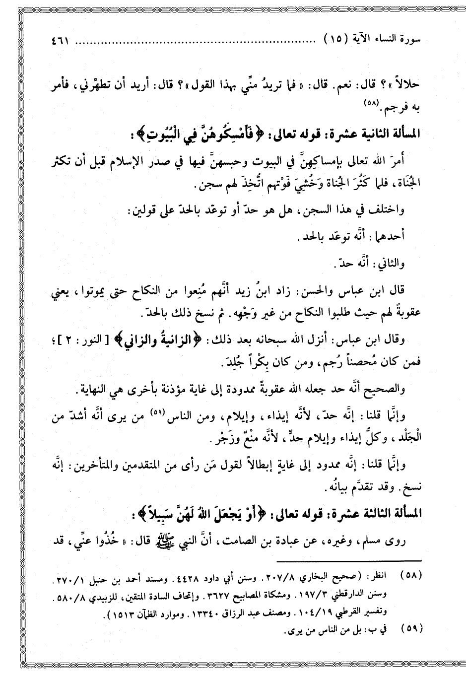 الْمَسْأَلَةُ الثَّالِثَةَ عَشْرَةَ: قَوْله تَعَالَى: {أَوْ يَجْعَلَ اللَّهُ لَهُنَّ سَبِيلا} [النساء: 15] رَوَى مُسْلِمٌ، وَغَيْرُهُ عَنْ عُبَادَةَ بْنِ الصَّامِتِ أَنَّ النَّبِيَّ - صَلَّى اللَّهُ عَلَيْهِ وَسَلَّمَ - قَالَ: «خُذُوا عَنِّي، قَدْ