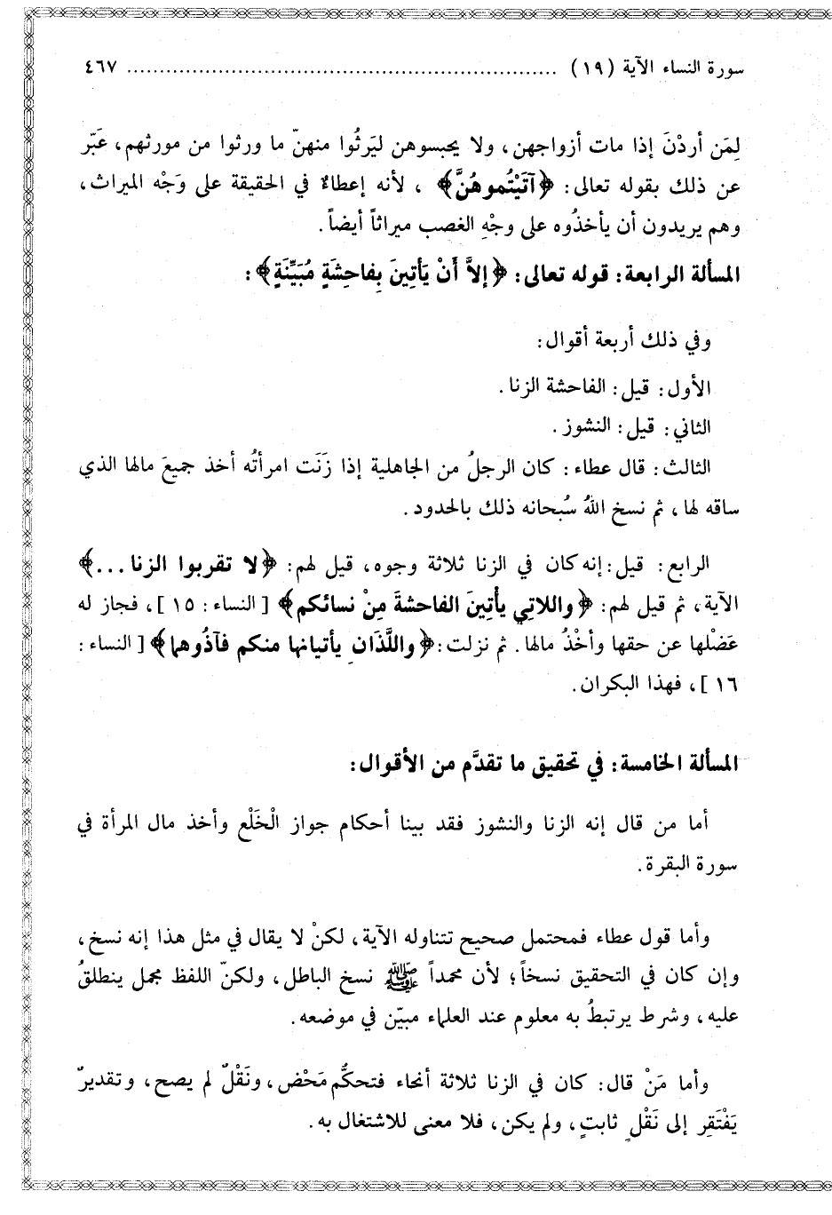 الْمَسْأَلَةُ الْخَامِسَةُ: فِي تَحْقِيقِ مَا تَقَدَّمَ مِنْ الْأَقْوَالِ: أَمَّا مَنْ قَالَ إنَّهُ الزِّنَا وَالنُّشُوزُ فَقَدْ بَيَّنَّا أَحْكَامَ جَوَازِ الْخُلْعِ وَأَخْذِ مَالِ الْمَرْأَةِ فِي سُورَةِ الْبَقَرَةِ. وَأَمَّا قَوْلُ عَطَاءٍ فَمُحْتَمَلٌ صَحِيحٌ تَتَنَاوَلُهُ الْآيَةُ، لَكِنْ لَا يُقَالُ فِي مِثْلِ هَذَا إنَّهُ نَسْخٌ، وَإِنْ كَانَ فِي التَّحْقِيقِ نَسْخًا؛ لِأَنَّ مُحَمَّدًا - صَلَّى اللَّهُ عَلَيْهِ وَسَلَّمَ - نَسَخَ الْبَاطِلَ، وَلَكِنْ اللَّفْظَ مُجْمَلٌ يَنْطَلِقُ عَلَيْهِ، وَشَرْطٌ يَرْتَبِطُ بِهِ مَعْلُومٌ عِنْدَ الْعُلَمَاءِ مُبَيَّنٌ فِي مَوْضِعِهِ. وَأَمَّا مَنْ قَالَ: كَانَ فِي الزِّنَا ثَلَاثَةُ أَنْحَاءٍ فَتَحَكُّمٌ مَحْضٌ، وَنَقْلٌ لَمْ يَصِحَّ، وَتَقْدِيرٌ يَفْتَقِرُ إلَى نَقْلٍ ثَابِتٍ، وَلَمْ يَكُنْ، فَلَا مَعْنَى لِلِاشْتِغَالِ بِهِ.