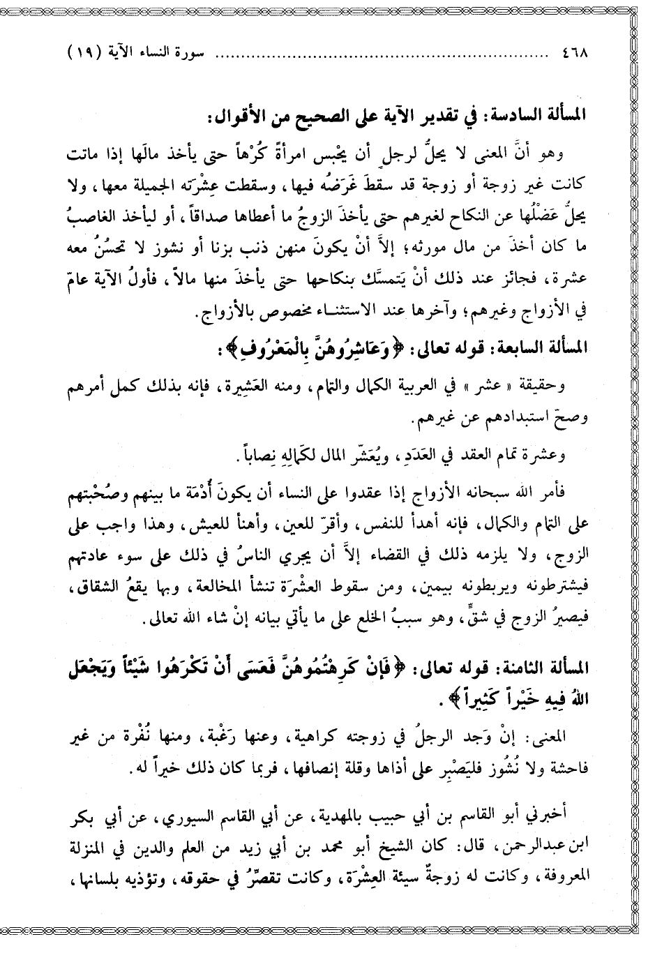الْمَسْأَلَةُ السَّادِسَةُ: فِي تَقْدِيرِ الْآيَةِ عَلَى الصَّحِيحِ مِنْ الْأَقْوَالِ: وَهُوَ أَنَّ الْمَعْنَى لَا يَحِلُّ لِرَجُلٍ أَنْ يَحْبِسَ امْرَأَةً كَرْهًا حَتَّى يَأْخُذَ مَالَهَا إذَا مَاتَتْ كَانَتْ غَيْرَ زَوْجَةٍ أَوْ زَوْجَةً قَدْ سَقَطَ غَرَضُهُ فِيهَا، وَسَقَطَتْ عِشْرَتُهُ الْجَمِيلَةُ مَعَهَا، وَلَا يَحِلُّ عَضْلُهَا عَنْ النِّكَاحِ لِغَيْرِهِمْ حَتَّى يَأْخُذَ الزَّوْجُ مَا أَعْطَاهَا صَدَاقًا، أَوْ لِيَأْخُذَ الْغَاصِبُ مَا كَانَ أَخَذَ مِنْ مَالِ مُوَرِّثِهِ؛ إلَّا أَنْ يَكُونَ مِنْهُنَّ ذَنْبٌ بِزِنًا أَوْ نُشُوزٍ لَا تَحْسُنُ مَعَهُ عِشْرَةٌ، فَجَائِزٌ عِنْدَ ذَلِكَ أَنْ يَتَمَسَّكَ بِنِكَاحِهَا حَتَّى يَأْخُذَ مِنْهَا مَالًا، فَأَوَّلُ الْآيَةِ عَامٌّ فِي الْأَزْوَاجِ وَغَيْرِهِمْ؛ وَآخِرُهَا عِنْدَ الِاسْتِثْنَاءِ مَخْصُوصٌ بِالْأَزْوَاجِ.