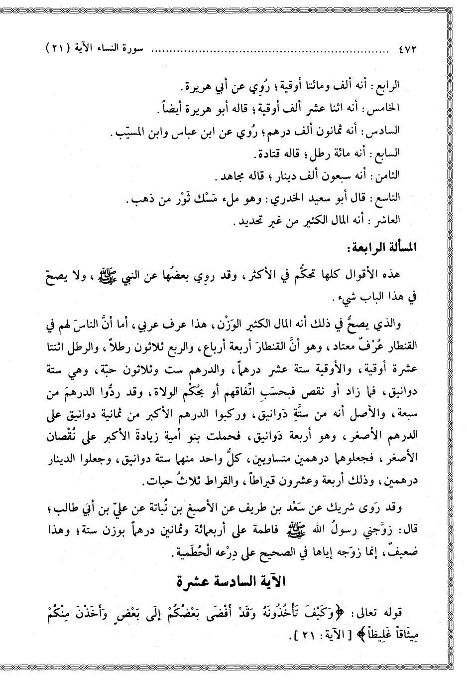 وَقَدْ رُوِيَ بَعْضُهَا عَنْ النَّبِيِّ - صَلَّى اللَّهُ عَلَيْهِ وَسَلَّمَ - وَلَا يَصِحُّ فِي هَذَا الْبَابِ شَيْءٌ. وَاَلَّذِي يَصِحُّ فِي ذَلِكَ أَنَّهُ الْمَالُ الْكَثِيرُ الْوَزْنِ، هَذَا عُرْفٌ عَرَبِيٌّ، أَمَّا أَنَّ النَّاسَ لَهُمْ فِي الْقِنْطَارِ عُرْفٌ مُعْتَادٌ، وَهُوَ أَنَّ الْقِنْطَارَ أَرْبَعَةُ أَرْبَاعٍ، وَالرُّبْعُ ثَلَاثُونَ رِطْلًا، وَالرِّطْلُ اثْنَتَا عَشْرَةَ أُوقِيَّةً، وَالْأُوقِيَّةُ سِتَّةَ عَشَرَ دِرْهَمًا، وَالدِّرْهَمُ سِتٌّ وَثَلَاثُونَ حَبَّةً، وَهِيَ سِتَّةُ دَوَانِيقَ، فَمَا زَادَ أَوْ نَقَصَ فَبِحَسَبِ اتِّفَاقِهِمْ أَوْ بِحُكْمِ الْوُلَاةِ، وَقَدْ رَدُّوا الدِّرْهَمَ مِنْ سَبْعَةٍ، وَالْأَصْلُ أَنَّهُ مِنْ سِتَّةِ دَوَانِيقَ، وَرَكَّبُوا الدِّرْهَمَ الْأَكْبَرَ مِنْ ثَمَانِيَةِ دَوَانِيقَ عَلَى الدِّرْهَمِ الْأَصْغَرِ، وَهُوَ أَرْبَعَةُ دَوَانِيقَ، فَحَمَلَتْ بَنُو أُمَيَّةَ زِيَادَةَ الْأَكْبَرِ عَلَى نُقْصَانِ الْأَصْغَرِ، فَجَعَلُوهُمَا دِرْهَمَيْنِ مُتَسَاوِيَيْنِ، كُلُّ وَاحِدٍ مِنْهُمَا سِتَّةُ دَوَانِيقَ، وَجَعَلُوا الدِّينَارَ دِرْهَمَيْنِ، وَذَلِكَ أَرْبَعَةٌ وَعِشْرُونَ قِيرَاطًا، وَالْقِيرَاطُ ثَلَاثُ حَبَّاتٍ. وَقَدْ رَوَى شَرِيكٌ عَنْ سَعْدِ بْنِ طَرِيفٍ عَنْ الْأَصْبَغِ بْنِ نُبَاتَةَ عَنْ «عَلِيِّ بْنِ أَبِي طَالِبٍ؛ قَالَ: زَوَّجَنِي رَسُولُ اللَّهِ - صَلَّى اللَّهُ عَلَيْهِ وَسَلَّمَ - فَاطِمَةَ عَلَى أَرْبَعِمِائَةٍ وَثَمَانِينَ دِرْهَمًا بِوَزْنِ سِتَّةٍ»؛ وَهَذَا ضَعِيفٌ، إنَّمَا زَوَّجَهُ إيَّاهَا فِي الصَّحِيحِ عَلَى دِرْعِهِ الْحُطَمِيَّةِ.