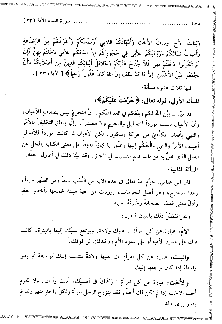 الْمَسْأَلَةُ الْأُولَى: قَوْله تَعَالَى: {حُرِّمَتْ عَلَيْكُمْ} [النساء: 23] قَدْ بَيَّنَّا بَيَّنَ اللَّهُ لَكُمْ وَبَلَّغَكُمْ فِي الْعِلْمِ أَمَلَكُمْ أَنَّ التَّحْرِيمَ لَيْسَ بِصِفَاتٍ لِلْأَعْيَانِ، وَأَنَّ الْأَعْيَانَ لَيْسَتْ مَوْرِدًا لِلتَّحْلِيلِ وَالتَّحْرِيمِ وَلَا مَصْدَرًا، وَإِنَّمَا يَتَعَلَّقُ التَّكْلِيفُ بِالْأَمْرِ وَالنَّهْيِ بِأَفْعَالِ الْمُكَلَّفِينَ مِنْ حَرَكَةٍ وَسُكُونٍ، لَكِنَّ الْأَعْيَانَ لَمَّا كَانَتْ مَوْرِدًا لِلْأَفْعَالِ أُضِيفَ الْأَمْرُ وَالنَّهْيُ وَالْحُكْمُ إلَيْهَا وَعُلِّقَ بِهَا مَجَازًا بَدِيعًا عَلَى مَعْنَى الْكِنَايَةِ بِالْمَحِلِّ عَنْ الْفِعْلِ الَّذِي يَحِلُّ بِهِ مِنْ بَابِ قِسْمِ التَّسْبِيبِ فِي الْمَجَازِ، وَقَدْ بَيَّنَّا ذَلِكَ فِي أُصُولِ الْفِقْهِ.