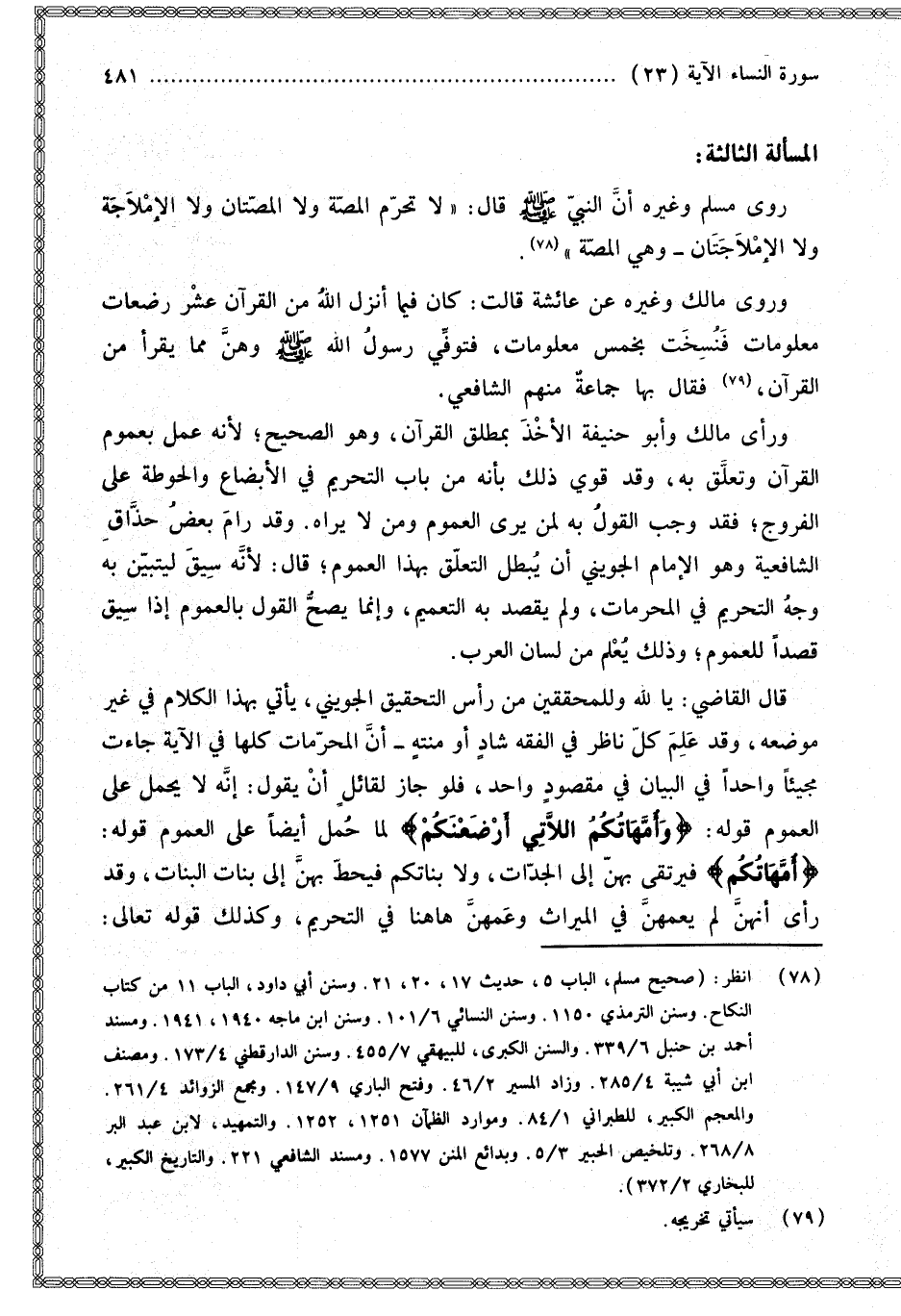 الْمَسْأَلَةُ الثَّالِثَةُ: رَوَى مُسْلِمٌ وَغَيْرُهُ أَنَّ النَّبِيَّ - صَلَّى اللَّهُ عَلَيْهِ وَسَلَّمَ - قَالَ: «لَا تُحَرِّمُ الْمَصَّةُ وَلَا الْمَصَّتَانِ وَلَا الْإِمْلَاجَةُ وَلَا الْإِمْلَاجَتَانِ وَهِيَ الْمَصَّةُ». وَرَوَى مَالِكٌ وَغَيْرُهُ عَنْ عَائِشَةَ قَالَتْ: كَانَ فِيمَا أَنْزَلَ اللَّهُ مِنْ الْقُرْآنِ عَشْرُ رَضَعَاتٍ مَعْلُومَاتٍ فَنُسِخَتْ بِخَمْسٍ مَعْلُومَاتٍ، فَتُوُفِّيَ رَسُولُ اللَّهِ - صَلَّى اللَّهُ عَلَيْهِ وَسَلَّمَ - وَهُنَّ مِمَّا يُقْرَأُ مِنْ الْقُرْآنِ. فَقَالَ بِهَا جَمَاعَةٌ مِنْهُمْ الشَّافِعِيُّ. وَرَأَى مَالِكٌ وَأَبُو حَنِيفَةَ الْأَخْذَ بِمُطْلَقِ الْقُرْآنِ، وَهُوَ الصَّحِيحُ؛ لِأَنَّهُ عَمَلٌ بِعُمُومِ الْقُرْآنِ وَتَعَلُّقٌ بِهِ، وَقَدْ قَوِيَ ذَلِكَ بِأَنَّهُ مِنْ بَابِ التَّحْرِيمِ فِي الْأَبْضَاعِ وَالْحَوْطَةِ عَلَى الْفُرُوجِ؛ فَقَدْ وَجَبَ الْقَوْلُ بِهِ لِمَنْ يَرَى الْعُمُومَ وَمَنْ لَا يَرَاهُ. وَقَدْ رَامَ بَعْضُ حُذَّاقِ الشَّافِعِيَّةِ وَهُوَ الْإِمَامُ الْجُوَيْنِيُّ أَنْ يُبْطِلَ التَّعَلُّقَ بِهَذَا الْعُمُومِ؛ قَالَ: لِأَنَّهُ سِيقَ لِيَتَبَيَّنَّ بِهِ وَجْهُ التَّحْرِيمِ فِي الْمُحَرَّمَاتِ، وَلَمْ يُقْصَدْ بِهِ التَّعْمِيمُ، وَإِنَّمَا يَصِحُّ الْقَوْلُ بِالْعُمُومِ إذَا سِيقَ قَصْدًا لِلْعُمُومِ؛ وَذَلِكَ يُعْلَمُ مِنْ لِسَانِ الْعَرَبِ. قَالَ الْقَاضِي: يَا لِلَّهِ وَلِلْمُحَقِّقِينَ مِنْ رَأْسِ التَّحْقِيقِ الْجُوَيْنِيُّ، يَأْتِي بِهَذَا الْكَلَامِ فِي غَيْرِ مَوْضِعِهِ، وَقَدْ عَلِمَ كُلُّ نَاظِرٍ فِي الْفِقْهِ شَادٍّ أَوْ مُنْتَهٍ أَنَّ الْمُحَرَّمَاتِ كُلَّهَا فِي الْآيَةِ جَاءَتْ مَجِيئًا وَاحِدًا فِي الْبَيَانِ فِي مَقْصُودٍ وَاحِدٍ، فَلَوْ جَازَ لِقَائِلٍ أَنْ يَقُولَ: إنَّهُ لَا يُحْمَلُ عَلَى الْعُمُومِ قَوْلُهُ: {وَأُمَّهَاتُكُمُ اللاتِي أَرْضَعْنَكُمْ} [النساء: 23] لَمَا حُمِلَ أَيْضًا عَلَى الْعُمُومِ قَوْلُهُ: {أُمَّهَاتُكُمْ} [النساء: 23] فَيُرْتَقَى بِهِنَّ إلَى الْجَدَّاتِ، وَلَا بَنَاتُكُمْ فَيَحُطُّ بِهِنَّ إلَى بَنَاتِ الْبَنَاتِ، وَقَدْ رَأَى أَنَّهُنَّ لَمْ يَعُمَّهُنَّ فِي الْمِيرَاثِ وَعَمَّهُنَّ هَاهُنَا فِي التَّحْرِيمِ، وَكَذَلِكَ قَوْله تَعَالَى: