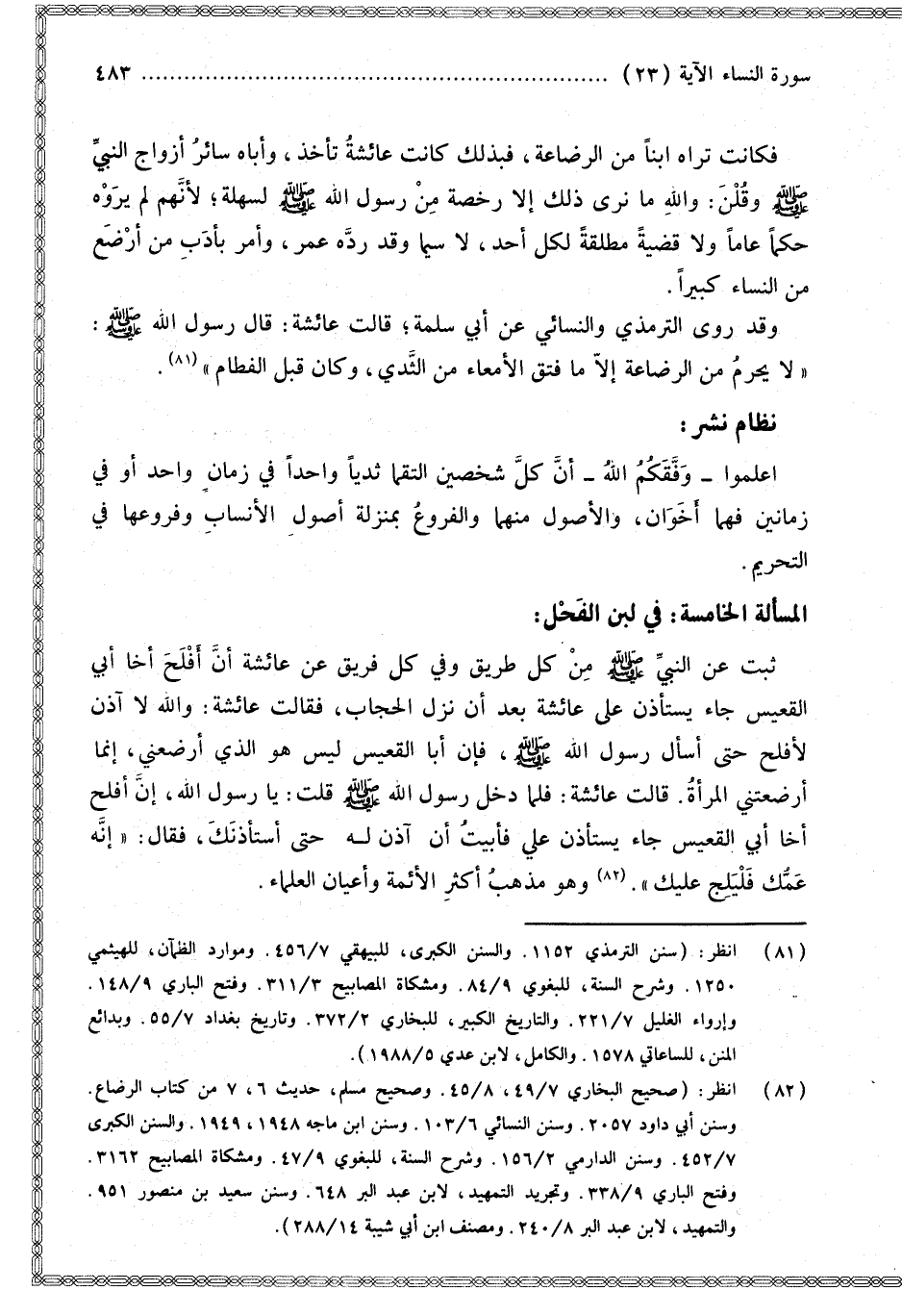 فَكَانَتْ تَرَاهُ ابْنًا مِنْ الرَّضَاعَةِ، فَبِذَلِكَ كَانَتْ عَائِشَةُ تَأْخُذُ، وَأَبَاهُ سَائِرُ أَزْوَاجِ النَّبِيِّ - صَلَّى اللَّهُ عَلَيْهِ وَسَلَّمَ - وَقُلْنَ: وَاَللَّهِ مَا نَرَى ذَلِكَ إلَّا رُخْصَةً مِنْ رَسُولِ اللَّهِ - صَلَّى اللَّهُ عَلَيْهِ وَسَلَّمَ - لِسَهْلَةَ؛ لِأَنَّهُمْ لَمْ يَرَوْهُ حُكْمًا عَامًّا وَلَا قَضِيَّةً مُطْلَقَةً لِكُلِّ أَحَدٍ، لَا سِيَّمَا وَقَدْ رَدَّهُ عُمَرُ، وَأَمَرَ بِأَدَبِ مَنْ أَرْضَعَ مِنْ النِّسَاءِ كَبِيرًا. وَقَدْ رَوَى التِّرْمِذِيُّ وَالنَّسَائِيُّ عَنْ أَبِي سَلَمَةَ؛ قَالَتْ عَائِشَةُ: قَالَ رَسُولُ اللَّهِ - صَلَّى اللَّهُ عَلَيْهِ وَسَلَّمَ -: «لَا يُحَرِّمُ مِنْ الرَّضَاعَةِ إلَّا مَا فَتَقَ الْأَمْعَاءَ مِنْ الثَّدْيِ، وَكَانَ قَبْلَ الْفِطَامِ». نِظَامُ نَشْرٍ: اعْلَمُوا وَفَّقَكُمْ اللَّهُ أَنَّ كُلَّ شَخْصَيْنِ الْتَقَمَا ثَدْيًا وَاحِدًا فِي زَمَانٍ وَاحِدٍ أَوْ فِي زَمَانَيْنِ فَهُمَا أَخَوَانِ، وَالْأُصُولُ مِنْهُمَا وَالْفُرُوعُ بِمَنْزِلَةِ أُصُولِ الْأَنْسَابِ وَفُرُوعِهَا فِي التَّحْرِيمِ.