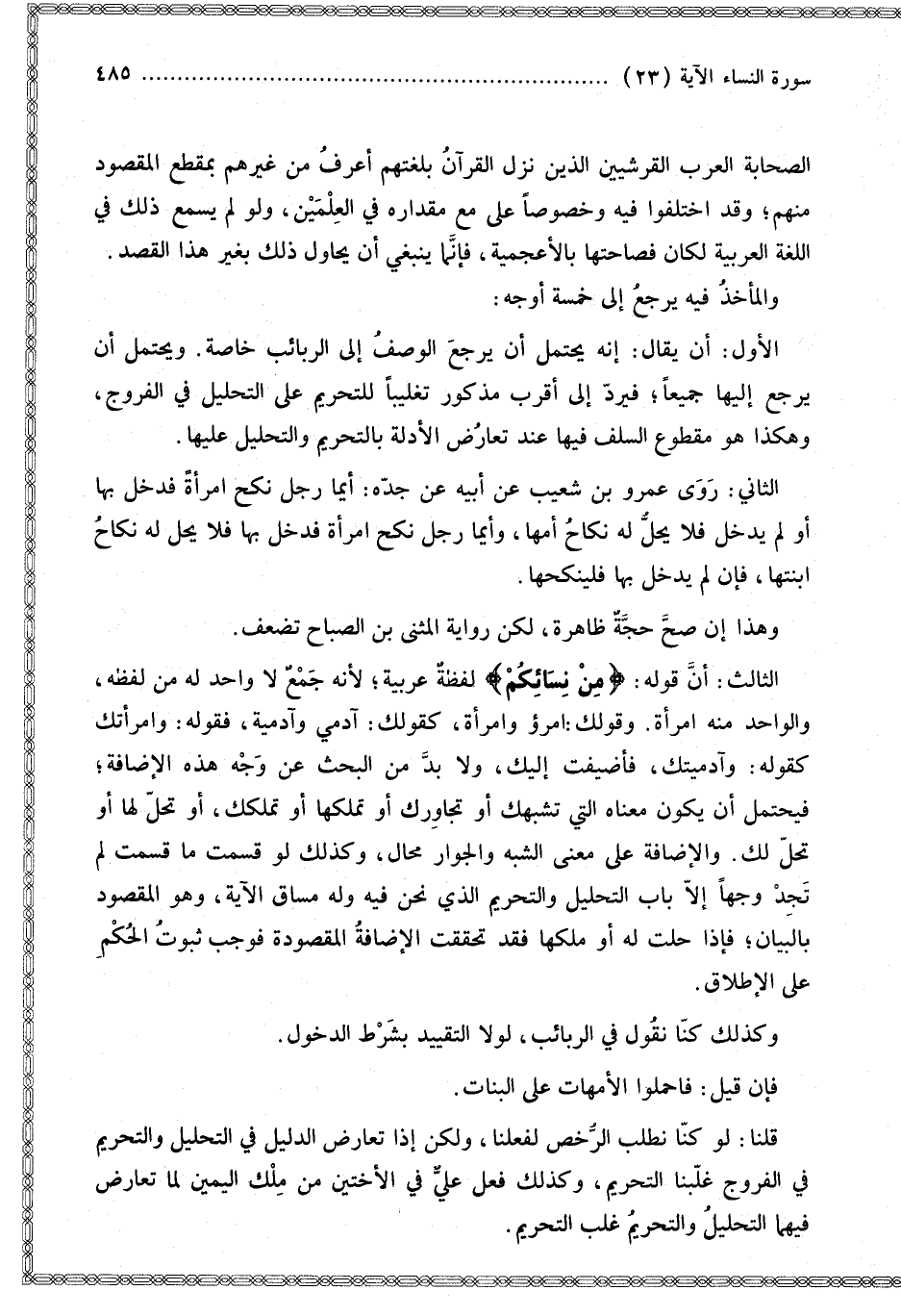 الصَّحَابَةَ الْعَرَبَ الْقُرَشِيِّينَ الَّذِينَ نَزَلَ الْقُرْآنُ بُلْغَتِهِمْ أَعْرَفُ مِنْ غَيْرِهِمْ بِمَقْطَعِ الْمَقْصُودِ مِنْهُمْ؛ وَقَدْ اخْتَلَفُوا فِيهِ وَخُصُوصًا عَلِيًّا مَعَ مِقْدَارِهِ فِي الْعِلْمَيْنِ، وَلَوْ لَمْ يُسْمَعْ ذَلِكَ فِي اللُّغَةِ الْعَرَبِيَّةِ لَكَانَ فَصَاحَتُهَا بِالْأَعْجَمِيَّةِ، فَإِنَّمَا يَنْبَغِي أَنْ يُحَاوَلَ ذَلِكَ بِغَيْرِ هَذَا الْقَصْدِ. وَالْمَأْخَذُ فِيهِ يَرْجِعُ إلَى خَمْسَةِ أَوْجُهٍ: الْأَوَّلُ: أَنْ يُقَالَ: إنَّهُ يَحْتَمِلُ أَنْ يَرْجِعَ الْوَصْفُ إلَى الرَّبَائِبِ خَاصَّةً.